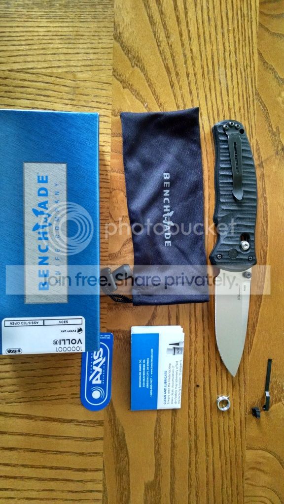 I have a never used or carried Benchmade Volli for sale. I am the original owner. I took it apart and removed the spring assist mechanism and the annoying safety feature. It now functions like a standard axis lock, smooth and fast. Blade is centered when closed and there are no wear marks that I can detect. There is no side to side blade play but there is a slight amount of vertical that was there right out of the box. It doesn't rattle or affect use but its there if you check for it. It has gotten better after de-assisting and a few openings. I believe it will continue to get better as the lock wears in. Comes with box, pouch, paper, and all the parts that I removed. Asking $100 shipped. Please email any questions. Not looking for trades at this time. Please do not post an I'll take it unless you are committed to buy.Thanks.