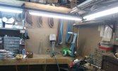 Here is where I thought I would put grinders. It is a corner, and put the VFD between the belt grinder and disc grinder. Do I want the belt grinder hanging over the edge of the bench? Maybe you can see I built some light brackets and lit it up but might still need something. I have tore my shop apart to redesign it for this adventure. I have a real concern with grinding in my AC area and that is one reason I wanted to do knives is to get off my feet so much and be comfortable doing something. Alot of folks would kill for a shop like I have with all my tools, and I want to get that passion back to be in it. But ya'll have about got me scared to grind in doors at all. Anyway here are 2 pics of that corner. Opinion appreciated how to set up disc and belt grinder. Elbow room ? Off edge or even ? Room between the 2 grinders ? Thanks again for all the help.