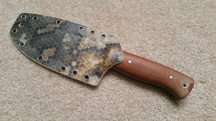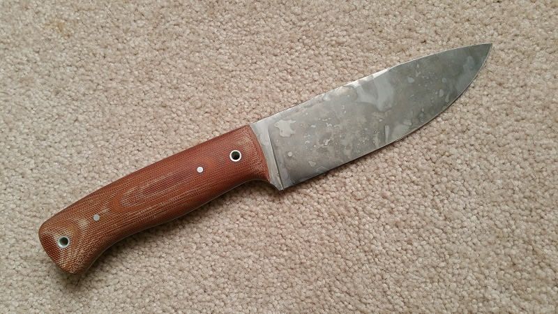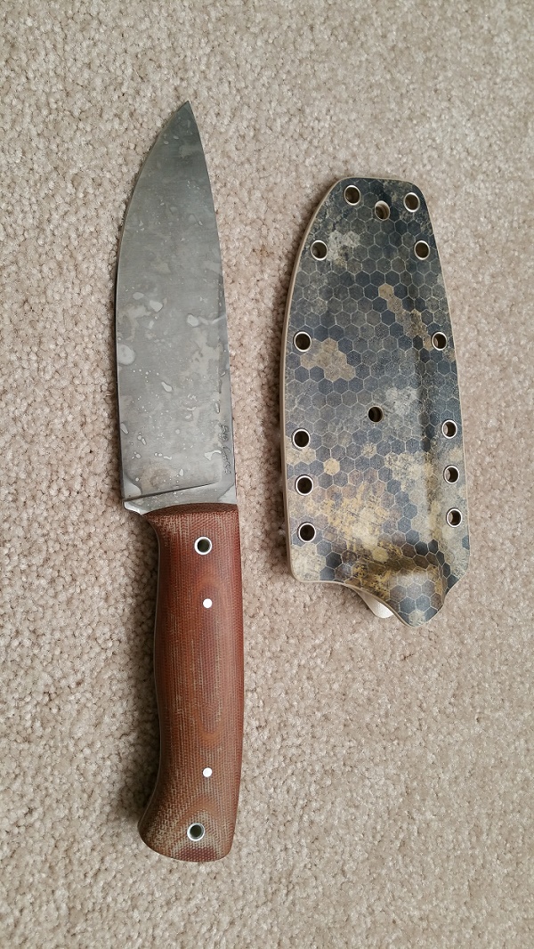 SOLD... Big Chris Voyager... 3/16" 01 steel w/ tapered tang, Natural Micarta, forced patina. A great all-around knife and beautifully balanced (right on the forward tube). Never used or sharpened. Includes a very nice, 'snap' fit, kydex sheath as shown in the photos. $250 ... I'll pick up PP fees and US shipping. Thanks for looking!