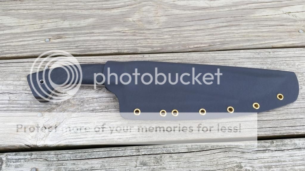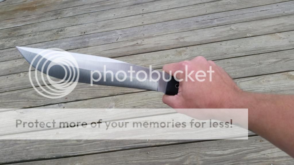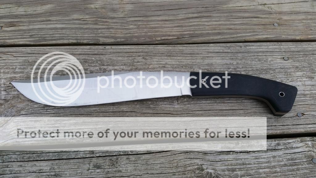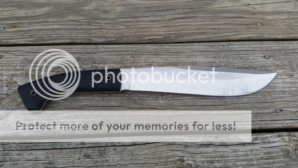 I have for sale a Bill Siegle Bowie that I've had for about a week now. I have used it to cut down some saplings and vines from a fence row. It definitely wouldn't hurt my feelings to hold onto this, but I have something else I would like to move on. This is made from 1/4 5160 steel and has rough black G10 scales. The specs are 14 7/8 overall with a 9 3/8 blade from the tip to scales. It will come with a kydex sheath that is spaced for a large Tek-Lok. The blade came with a few light scratches and there are a few more from the sheath and use now but nothing that can't be removed. There is a light patina forming from the vines I cut through and there is still some oil in the pictures that I had on the blade. The sheath came pretty loose and I used a blow dryer to better fit it to the blade. There is no rattle and it fits nicely. The edge came nice and sharp and I have stropped it so that it will easily cut paper. I'm looking to get $SPF shipped CONUS via USPS Tuesday with payment made via paypal gift or add 3%. The only trades I would be interested in would be for a Survive! GSO 3.5 or 4.1. I could add cash on my end for the right deal. You can reach me best at pumpkinhead0713@yahoo.com. The original sale thread is located here http://www.bladeforums.com/forums/s...mmer-sale-repost?highlight=end+of+summer+sale
