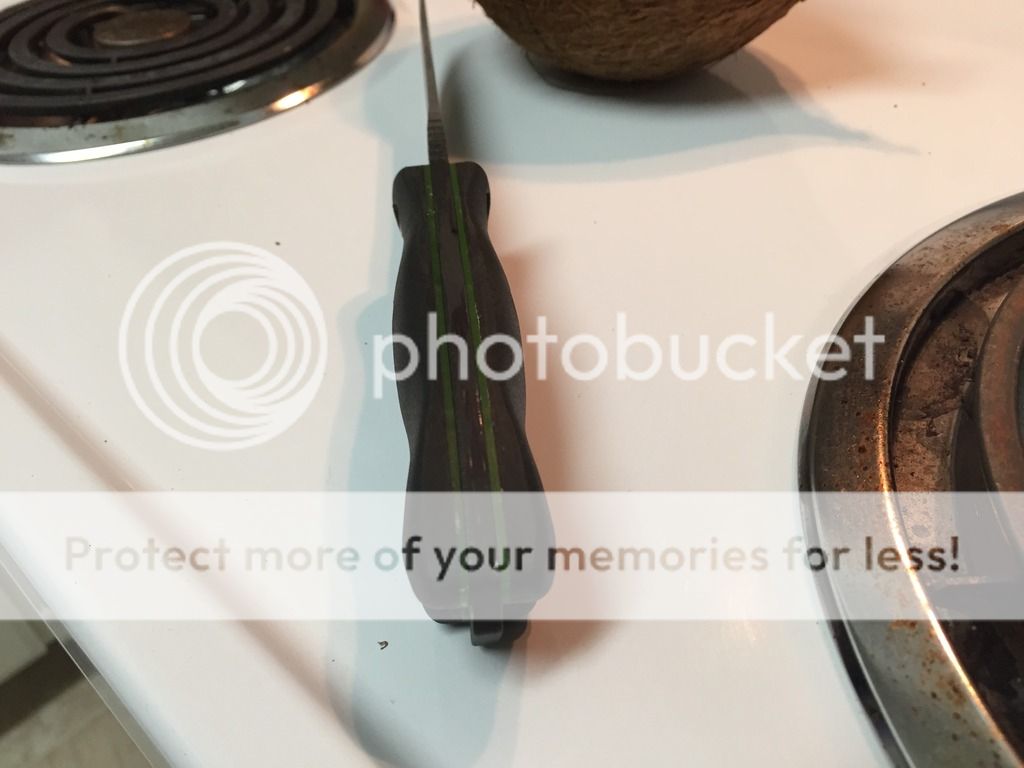 I figured it was a good idea to try and carve off the top of the coconut that way i could easily pour the joice out. How hard could it be? It turns out that coconuts are pretty friggin hard! While I'm confinent that with a good swing i could have gotten in with my BK4, i wasn't doing that in my kitchen, and that would also send the juice everywhere! haha