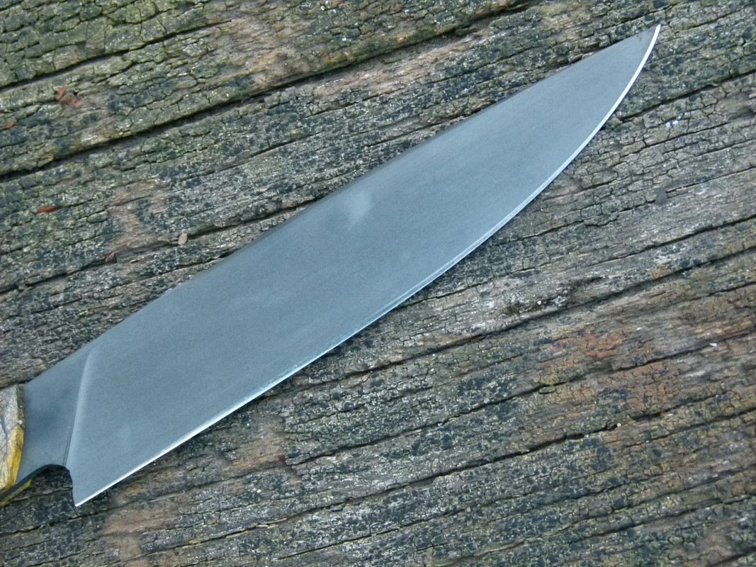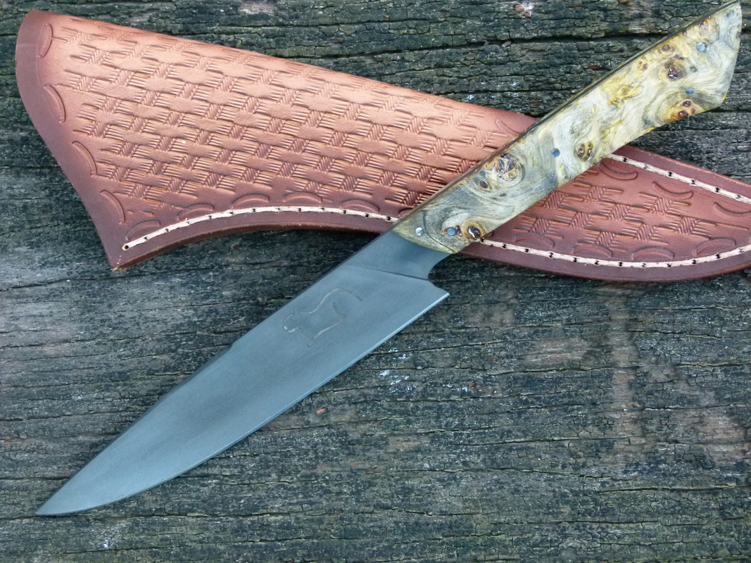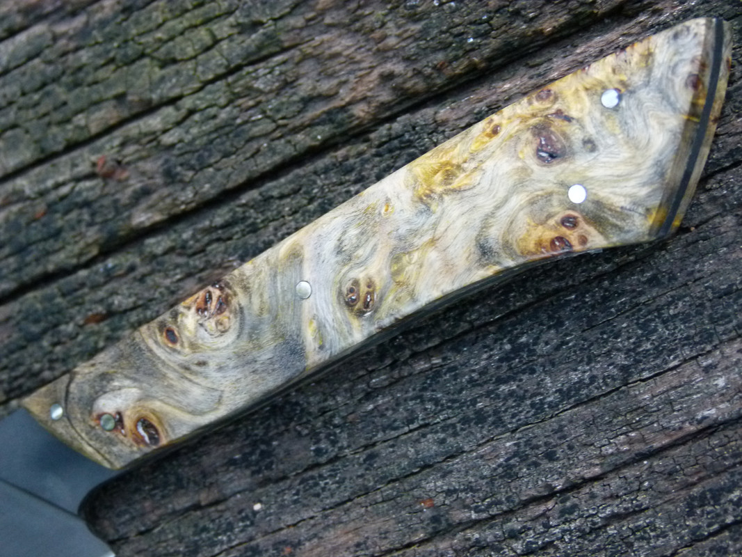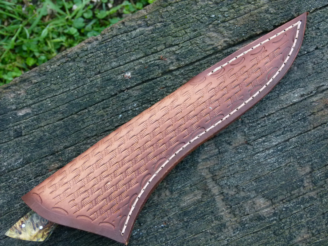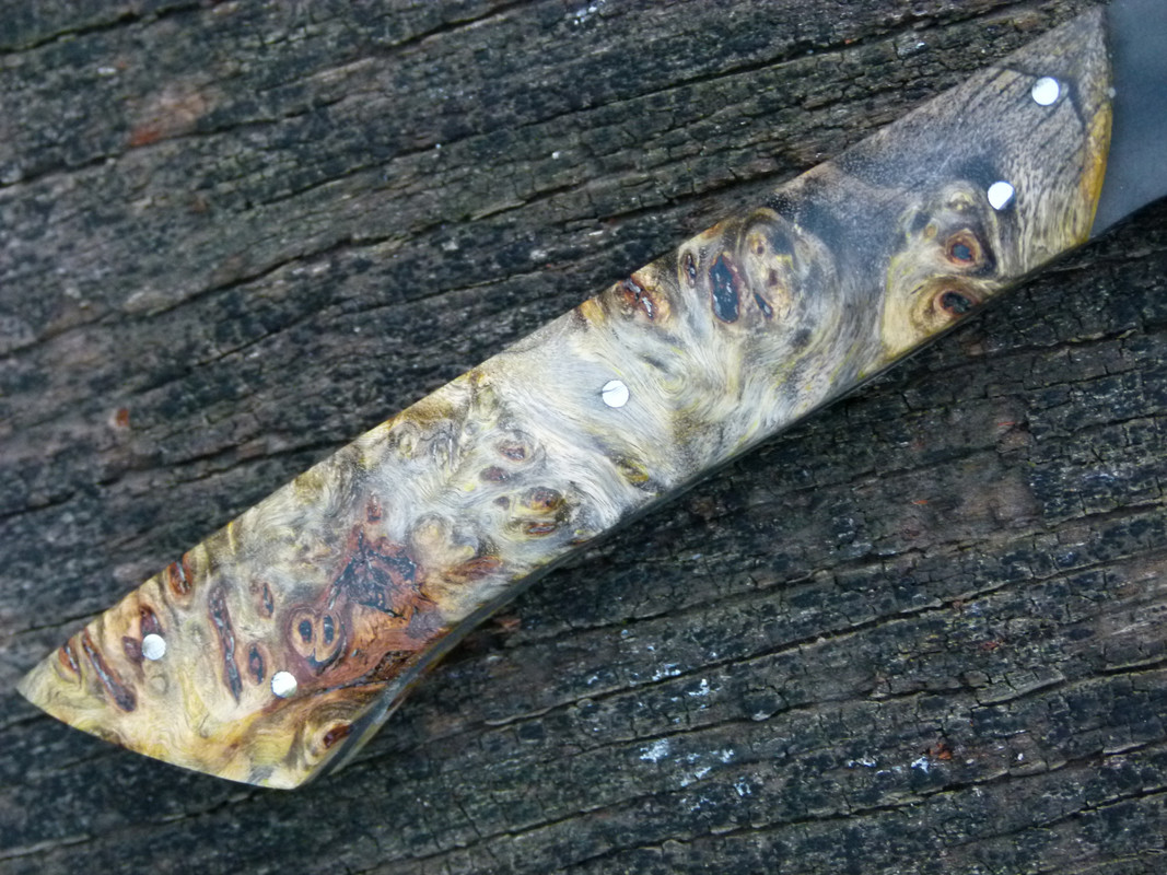 the wood is stabilized burl maple, goes with a handmade leather sheath.