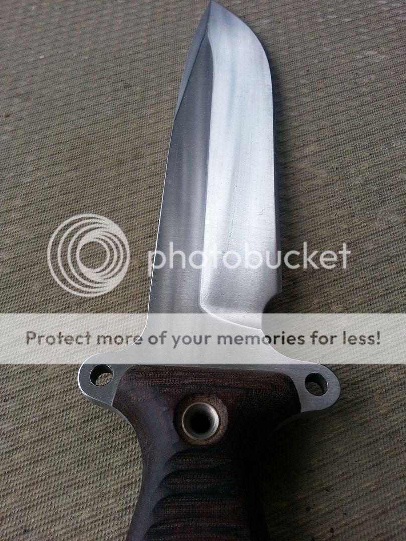 Blade '14 Team Gemini. This is the blade Rambo should have had at his side. local law enforcement and afghan troops would have backed a way slowly at the business end of this beauty. A tigerhide slabbed team gemini lightly used. It was stabbed into a soft poplar tree (to hold the tp), carried in a sheath and used to cut meat. The only indication that it has been used is some light scratching (flitz should cure these). The blade has not been sharpened or molested in any other way. I am asking SPF$usd shipped and insured to canada or the lower 48. the tactical cardboard is included.