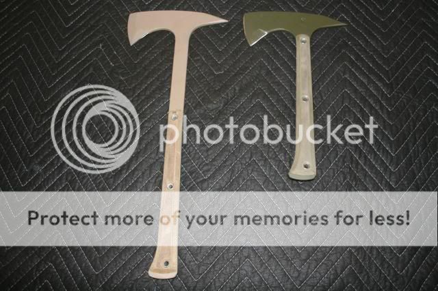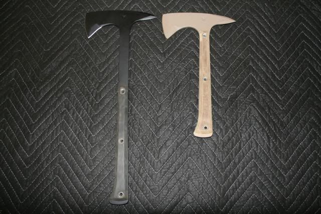 These are quite the departure from how I typically work. The blanks are waterjetted from 1/4" 4140 plate, then I normalize, grind, and heat treat, making them completely stock removal. This is the very first batch ready for sale. There are hammer polls, pry spikes, and combat spikes, each in either 12" overall length or an 18" overall length, with or without sharpened inner beards, and in either black, desert colors, or olive drab color schemes. The handle slabs are canvas Micarta using flared stainless steel tubing rivets and the steel is coated in Durabake.