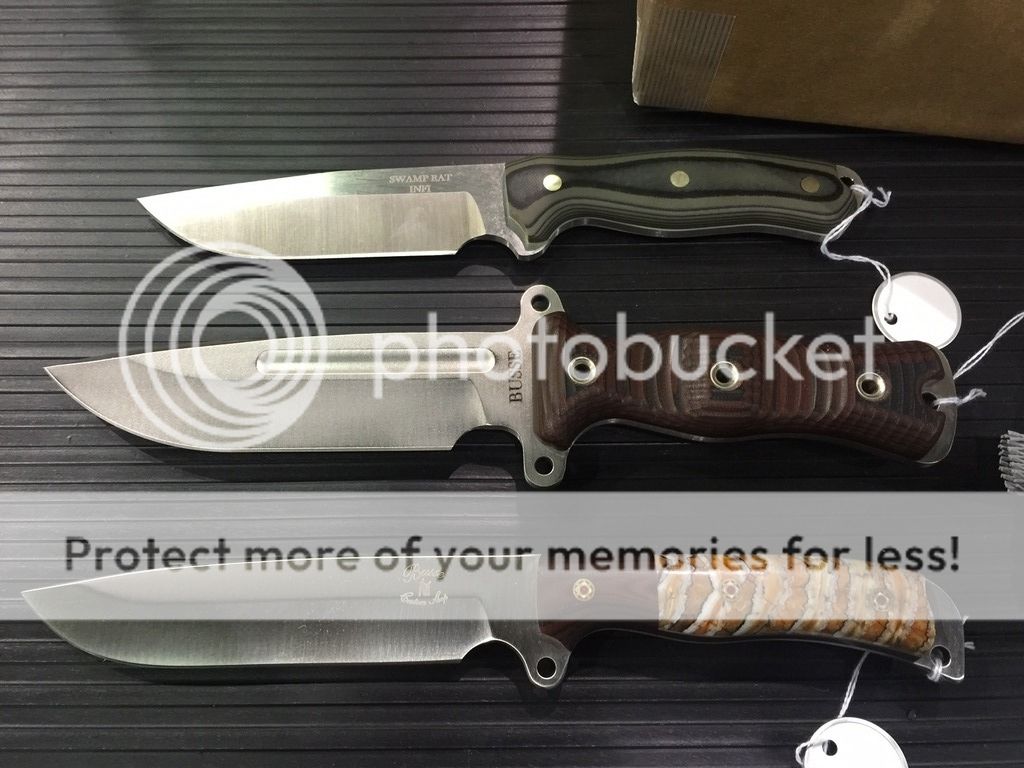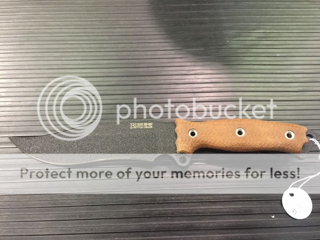 Scored some good stuff today. Mammoth handled Boss Jack, hand shaped green/black Infidu, comp finish TGM. I also got lucky and scored a 1 of 3 Moabolo with tigerhide scales and Alabama clay coating (a coating that Busse has not used in years). Very expensive, but very cool! Lastly, a custom shop BG SFNO bowie variant with a nice recurve blade.