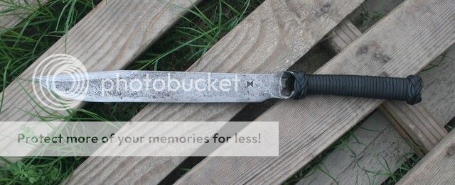 It is forged from 5160 steel, with a blade approximately 12" long. The top bevel is a false edge. The handle is an integral socket with a black paracord wrap with two-strand Turk's head knots fore and aft, impregnated with marine epoxy. It shaves hair, of course.