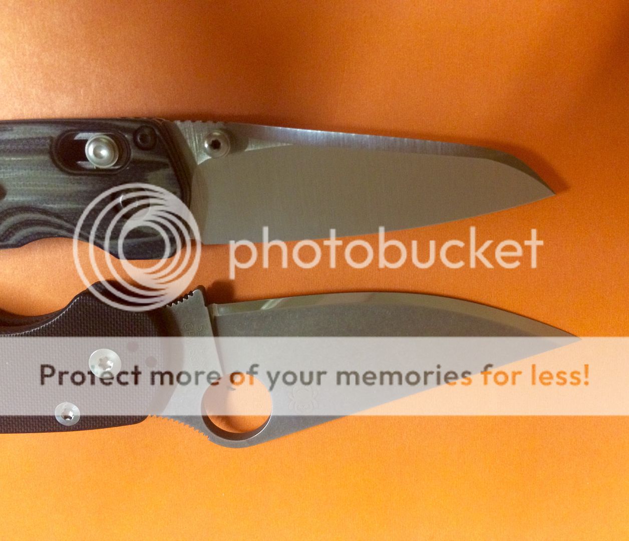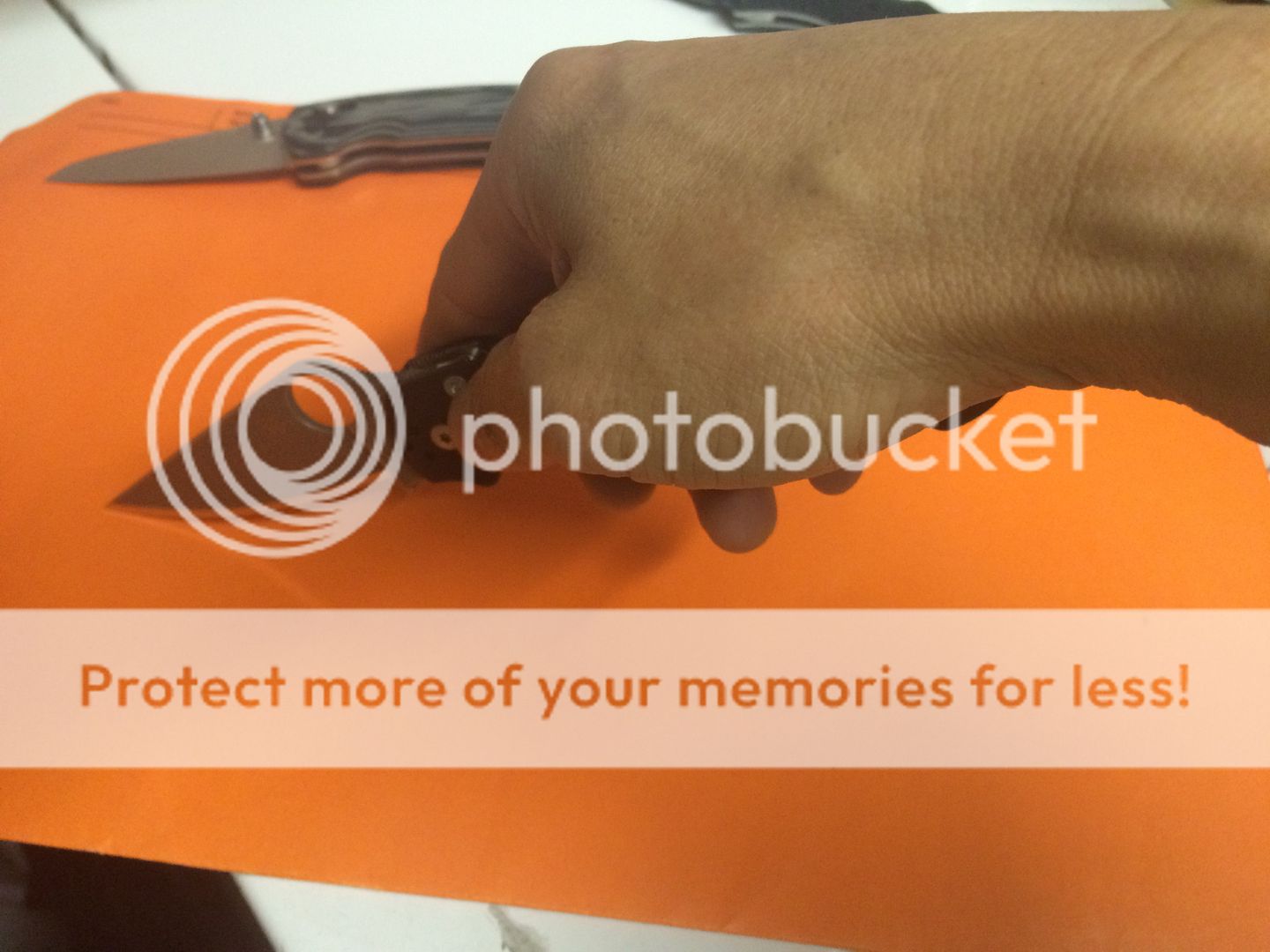 As you can see, the blade is now very usable from the tip to the end, notice how low the handle is stilted up when I use the tip; in comparison, the mini barrage I have to tilt the handle way up to use its tip to start a cut, same with the Paramilitary, I also took a comparison pic of the edge length against the para and the blade length is nearly the same with 2/3 of the handle and closed length. The handle is very comfy, it feels just right in my hand and