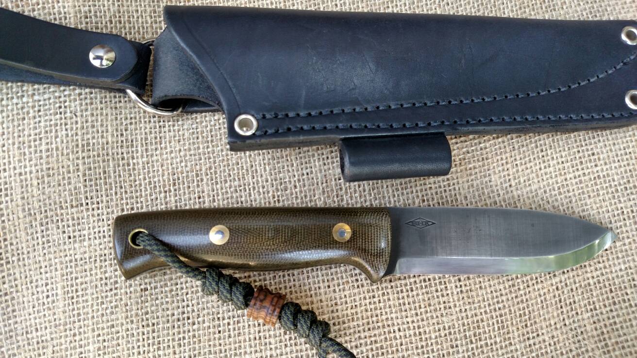 Blind Horse Boat Tail. Flat grind, bead blasted green micarta scales and a right handed hip sheath. No use since I bought it from a vendor. $110 SOLD