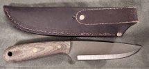D2 steel, Scandi grind, Black Canvas Micarta, and it comes with a leather sheath.