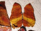 So, here are a few pictures of the bright Jaspers and a couple of a "blue" Agate I found. I did find two pieces of the jasper that look pretty similar to rooster tail agate out of Mexico and some that has a blue veining that makes the stone look like Dinosaur bone. So far none of the blue veined pieces have had sections big enough for knives.