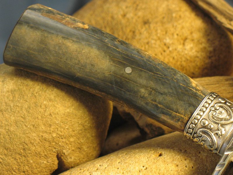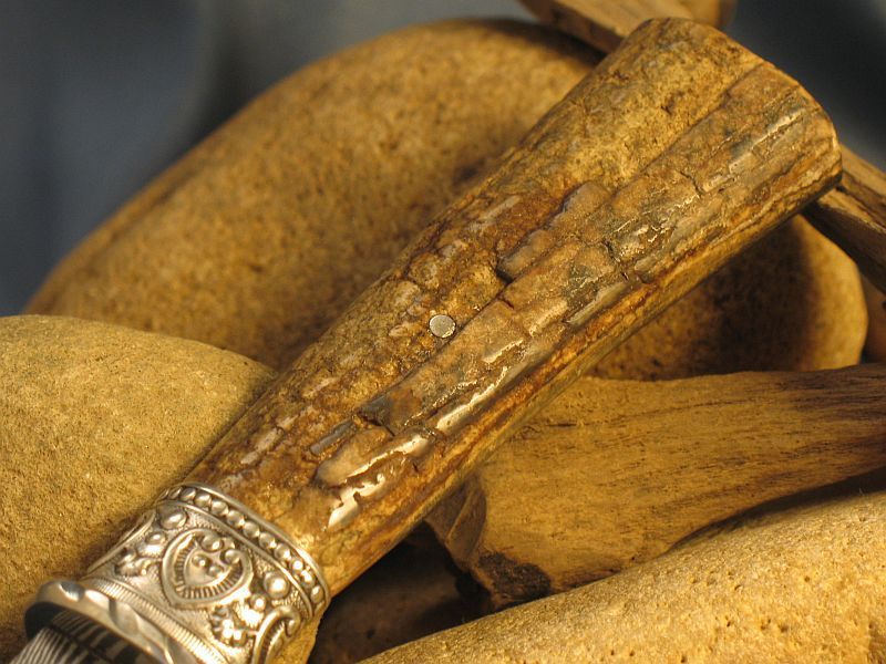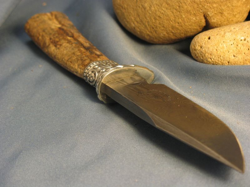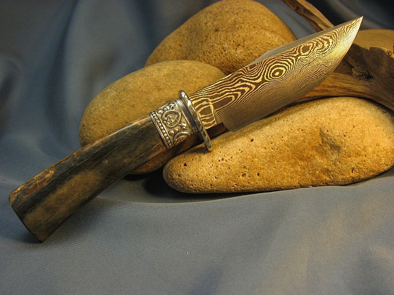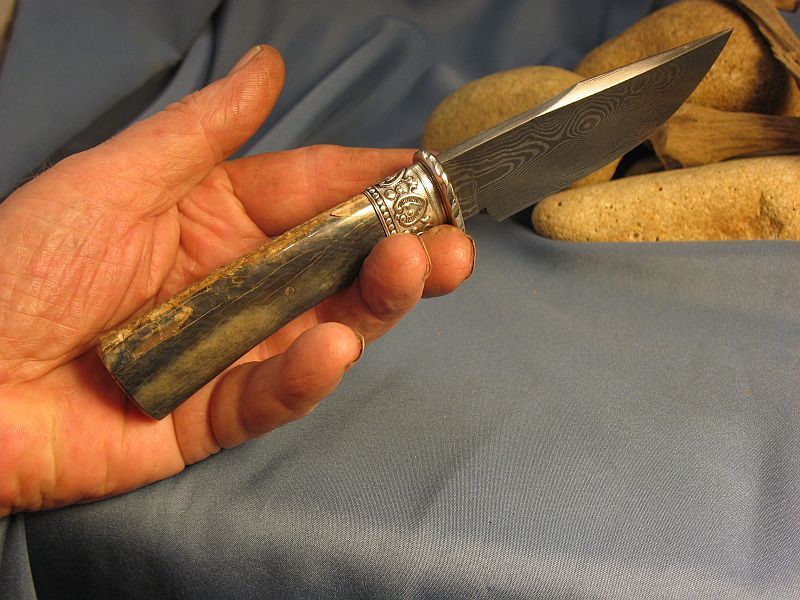 This is one I just completed of Fossil Walrus ivory , nickel silver, sterling silver ferrule and my Damascus of 1084 fine grain and 15n20. The handle is a nice tusk tip with Blue color that did not come out well with the photograph. Blue is really rare. The other side is crackle ivory that is solid. SHARP! Blade length is 7 1/8 inches and overall length is 12 1/8 inches. Sheath included. Any questions please ask. "SOLD" and 6.00 priority mail in USA. My e-mail and paypal is dangraves4923@earthlink.net And Yes, I Hope you like it as much as I enjoyed making it.