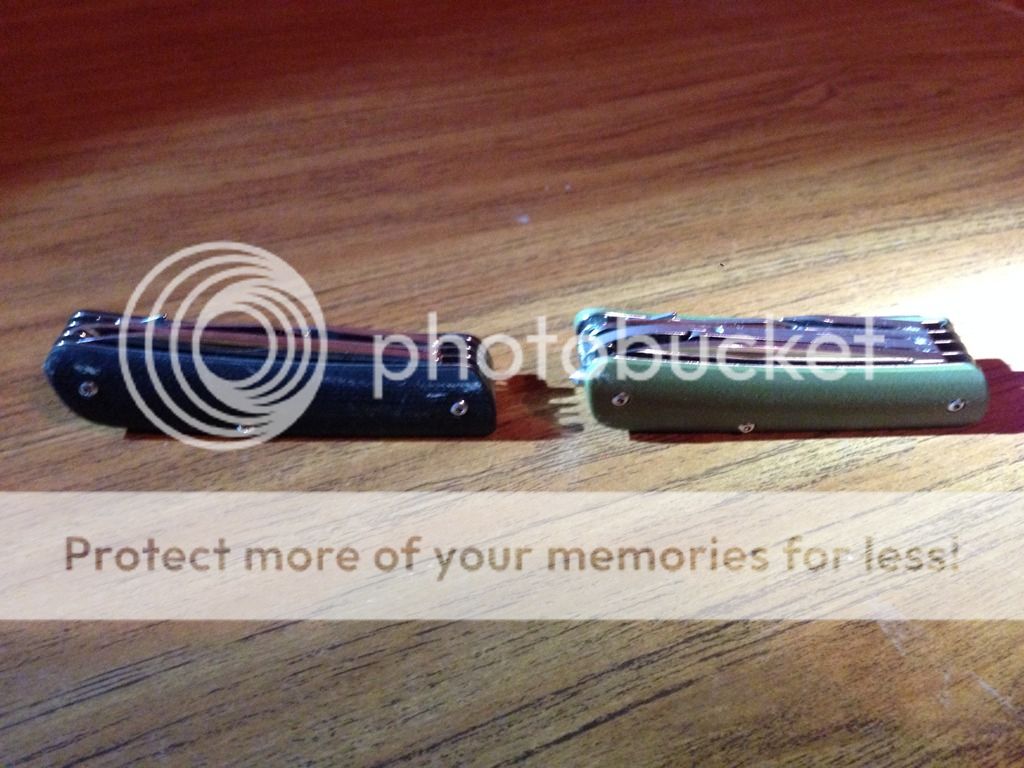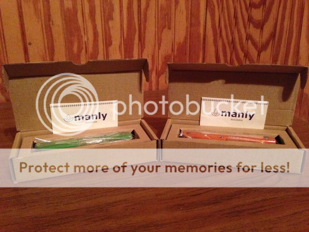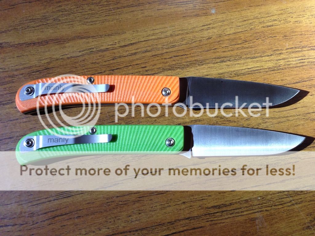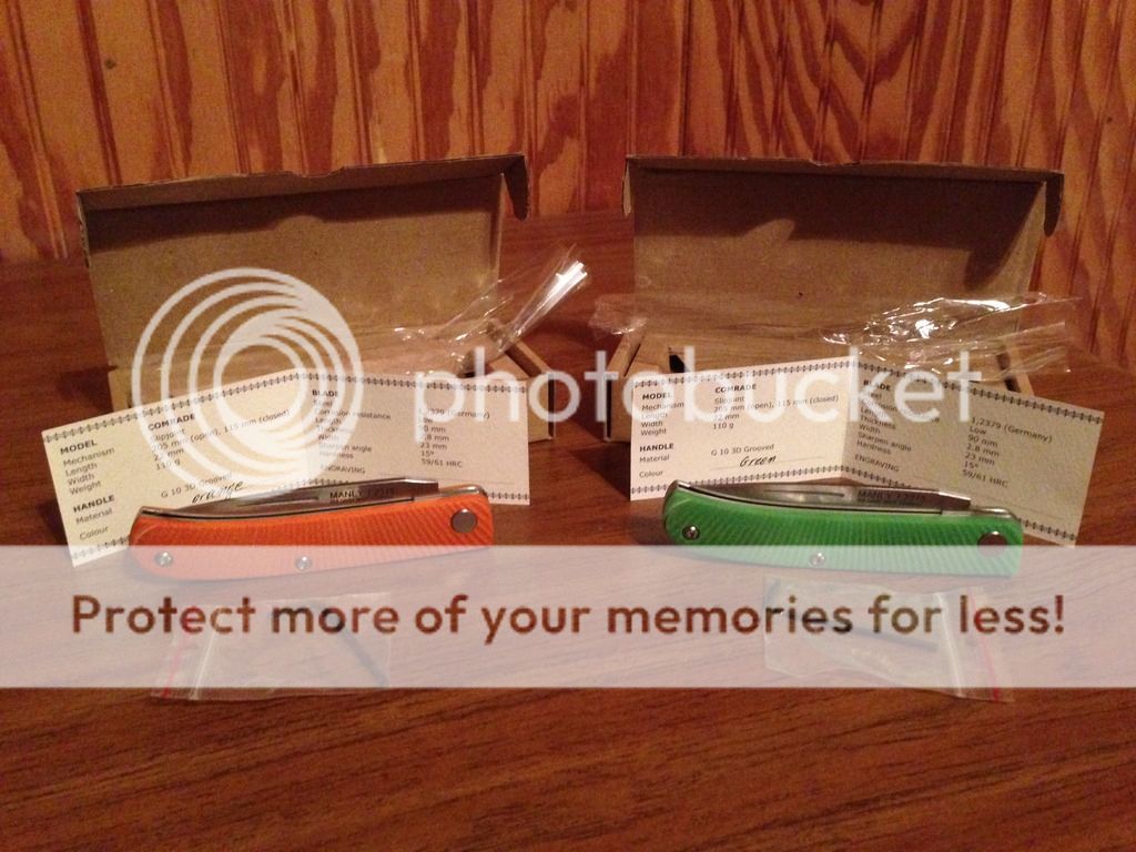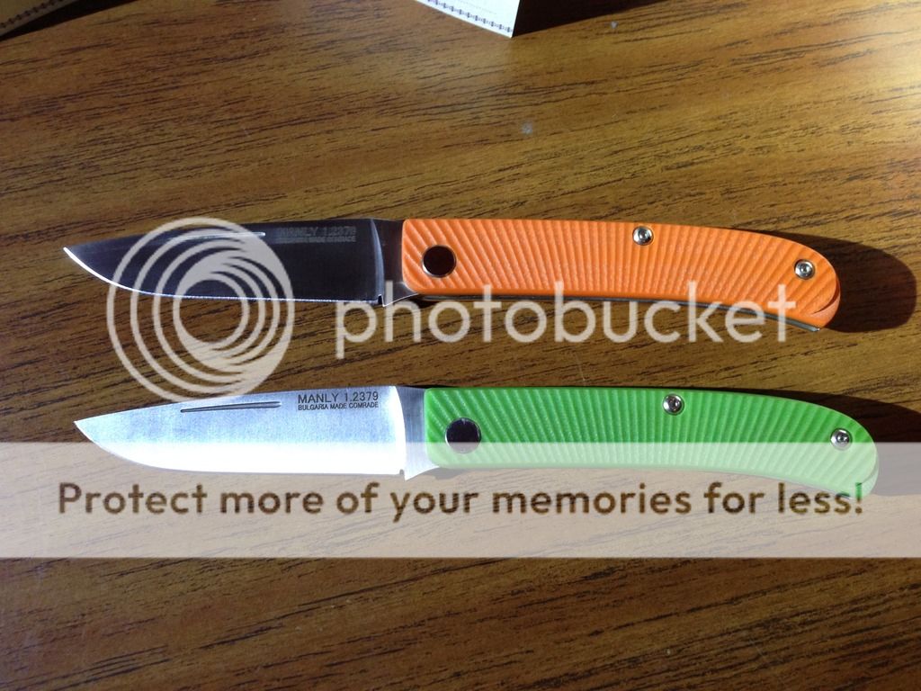 Next are the Manly Comrades. Both are 1.2379 steel which is the German relative of D2. These are slip joint folders which makes them unique in that they are legal to carry where some knives would not be. The "slip joints" however are tough and not your regular slip joint. Textured G-10 handles box also comes with a card that includes the specifics and a take down Allen wrench much like a Sebenza. Going for $40 each shipped via USPS Priority 2-3 day shipping with delivery confirmation.