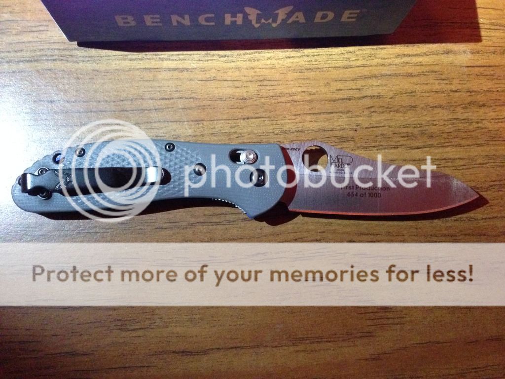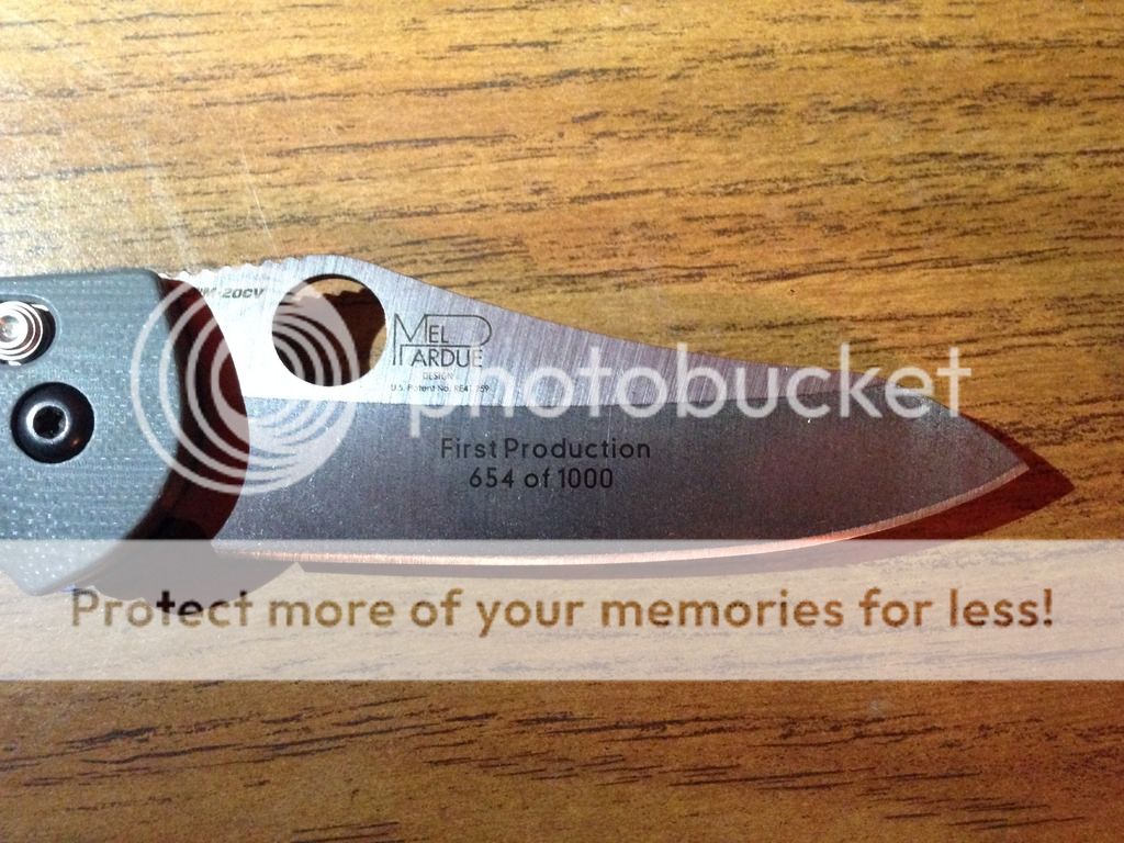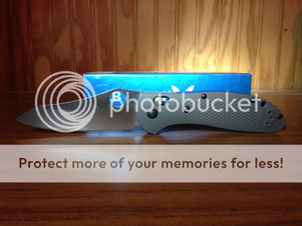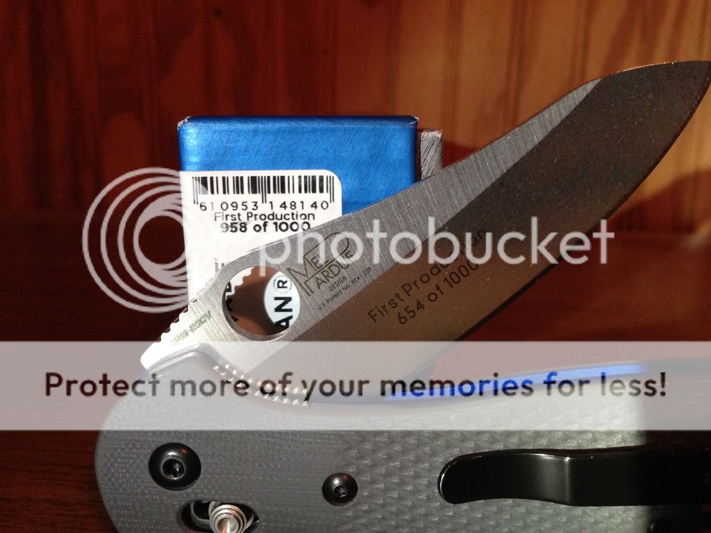 First on the chopping block is the Benchmade Griptilian 550-1 with CPM-20CV blade steel and numbered 654 / 1000. Funny thing is when I bought this locally at a storefront the box provided shows 958 / 1000 so this has A box but not exactly THE box. I've carried this but of course pampered it, never sharpened it, barely cut anything with it and I am the only owner. Going for $145 shipped to make this move. Includes USPS Priority 2-3 day shipping with delivery confirmation.