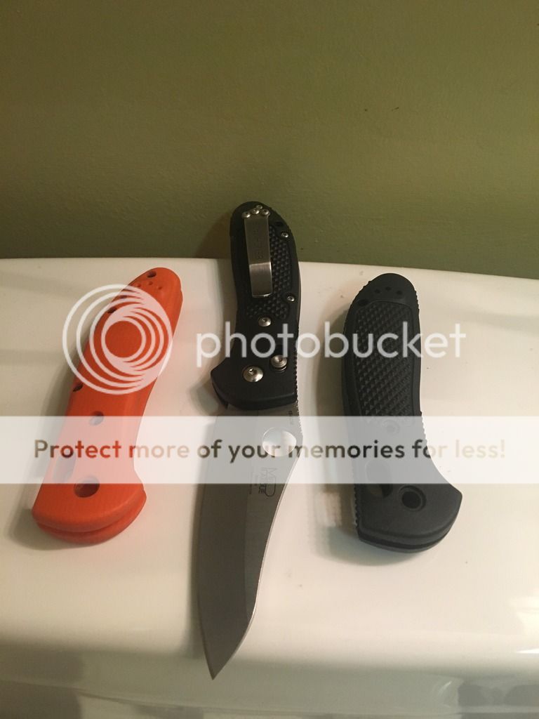 For sale is a BM550 in 154cm with black FRN scales. Blade never used but was sharpened to 500 grit on Shaptons. Also included is an extra set of black FRN scales and orange g10 KSF scales. Everything for $130!
