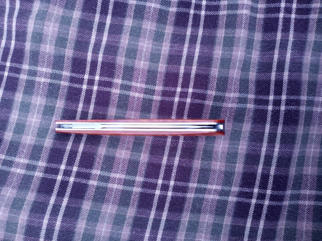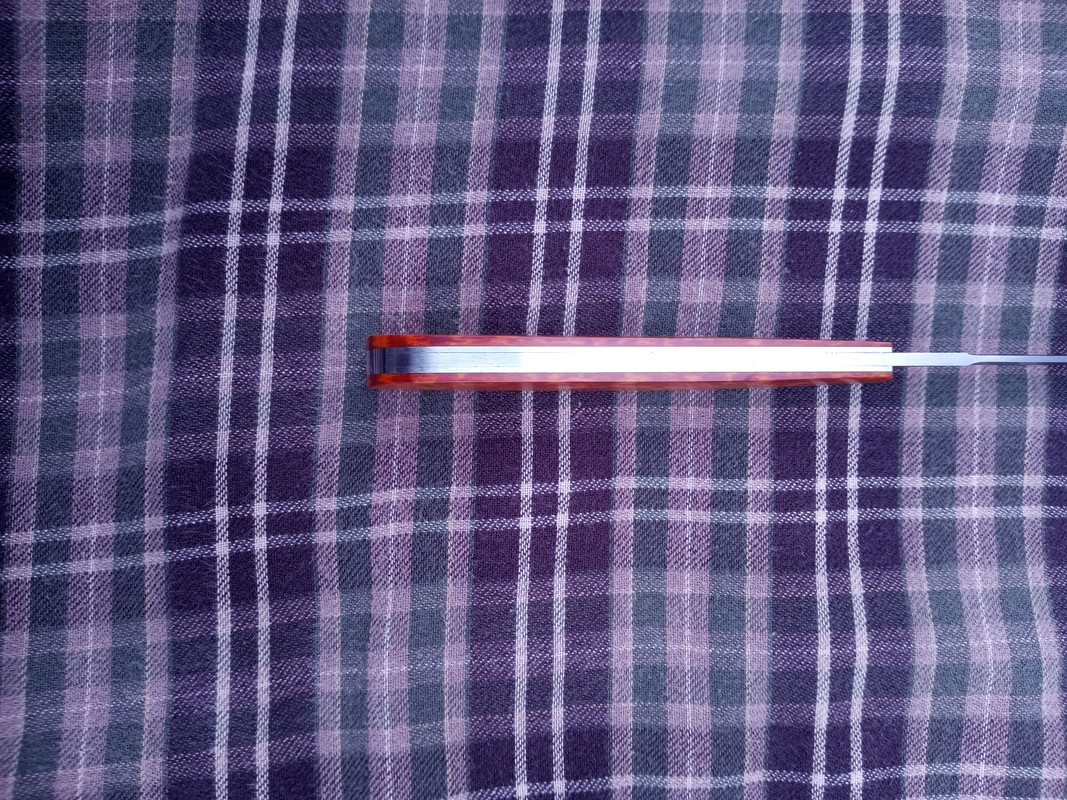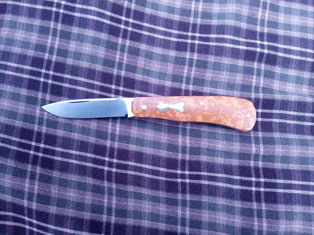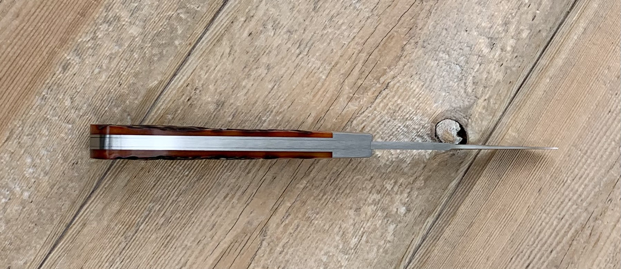 John Lloyd Menefee Pacheco pattern. 52100 steel. 4 1/8 closed 7 1/4 OAL. Pull is about a 7. Old cheddar micarta scales. Flush in all three positions. Well centered no gaps.