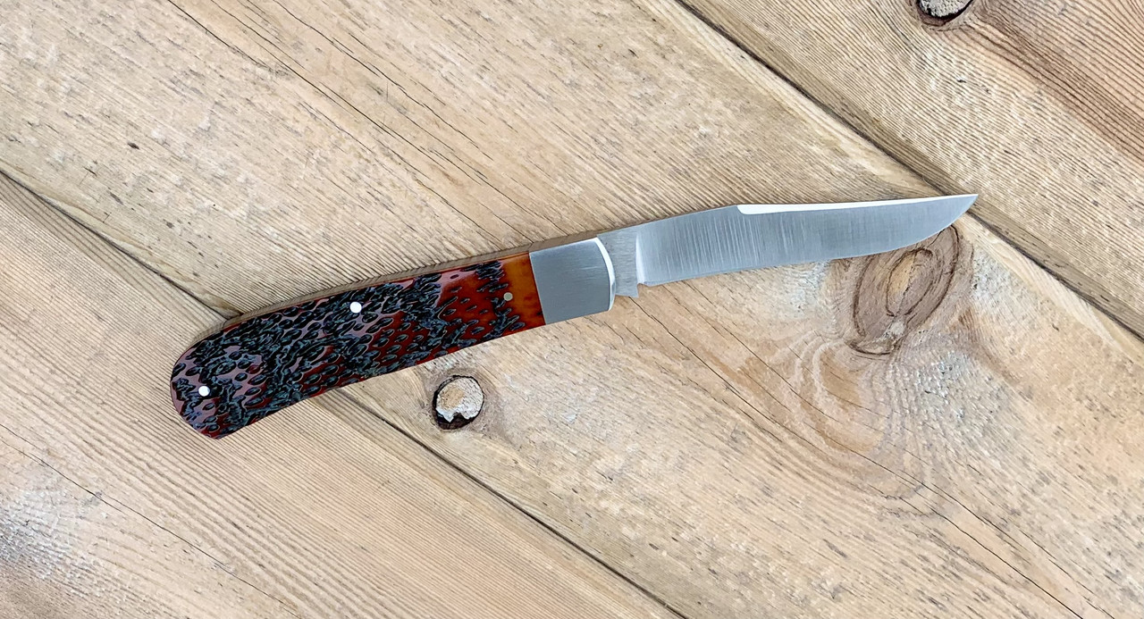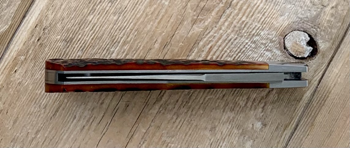 John Lloyd bose pattern backpocket in cpm 154 steel. 4 5/8ths closed 8 1/8 OAL. 5 plus to 6 pull. Great action, flush in all three positions. Nice jigged bone. The makers stamp is light on this one.