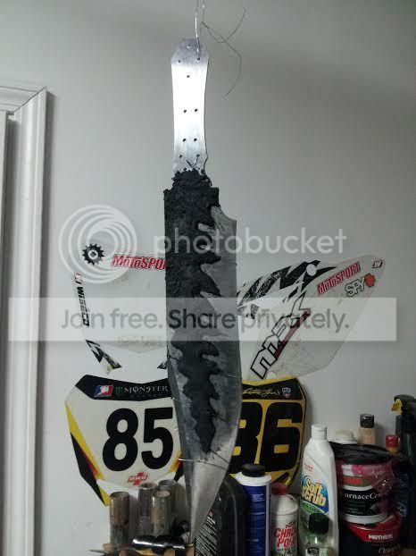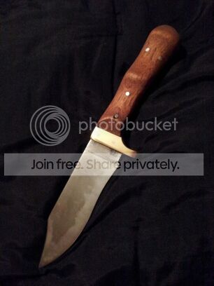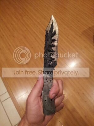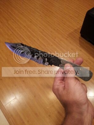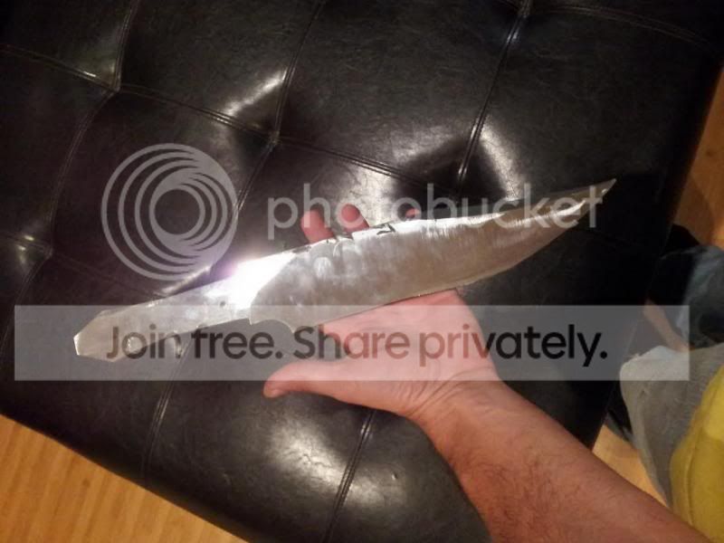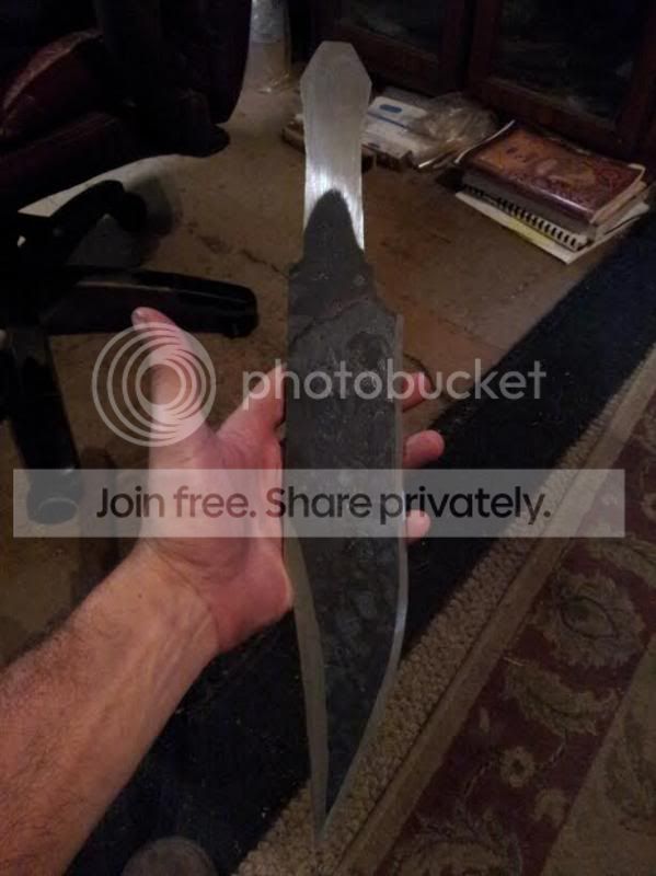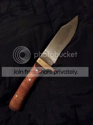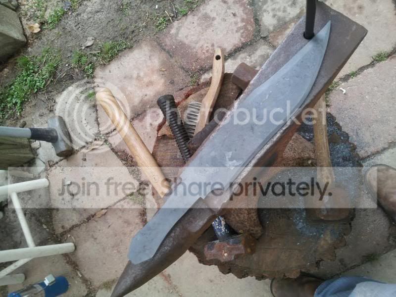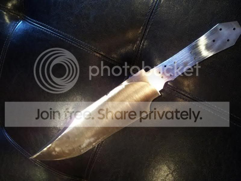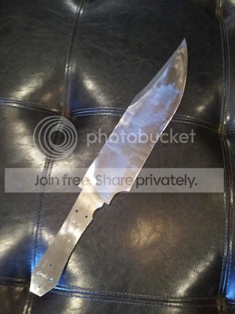 Started on a couple knives this past Friday, working to get big #7 and #8 under my belt lol. A large Bowie for the guy who built my gas forge and a small hunter for the guy who gave me my KAOwool for the forge. The Bowie isn't designed as a fighter but will used instead for bushwhacking, so we went with .25" 1095. Has a nice Distal taper and a tapered tang. The guard will be brass and the handle scales I haven't decided yet but will be an organic product, probably some sort of hardwood (opinions and critique welcome) . Using 3/8" stainless tubing to pin the Bowie scales and 1/8" stainless pins on the hunter. The hunter will have brass lower guard only and Cypress handle scales. Both clay tempered.
