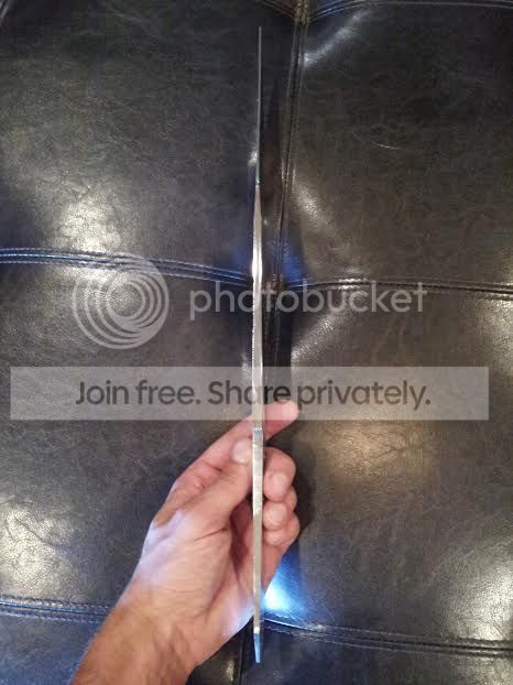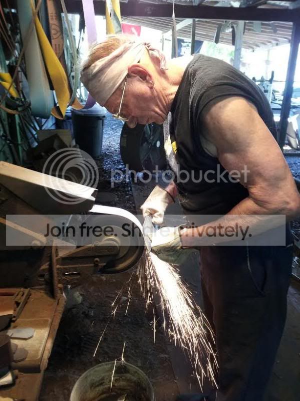 . He's walking me through the Bowie, of which I have already destroyed the primary grind, Oh well, it was the first time to try and attempt that design. Seems like I foul everything up on the first go. Hopefully I'll nail it next time. Anyhow, I forged the profile and the tapers into the blade then jumped to the grinder where he jumped in and started all my bevels for me talking me through some key points. I really like seeing the individual differences in process from one maker to the next. That's when I learn the most, seeing individuals of different skill levels do a different process to acquire similar/same results.
