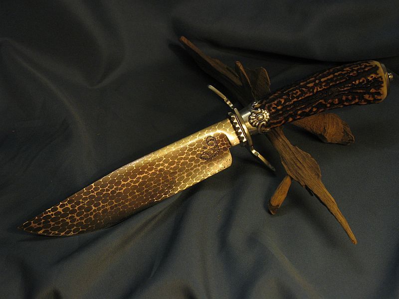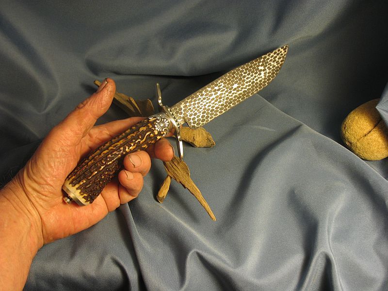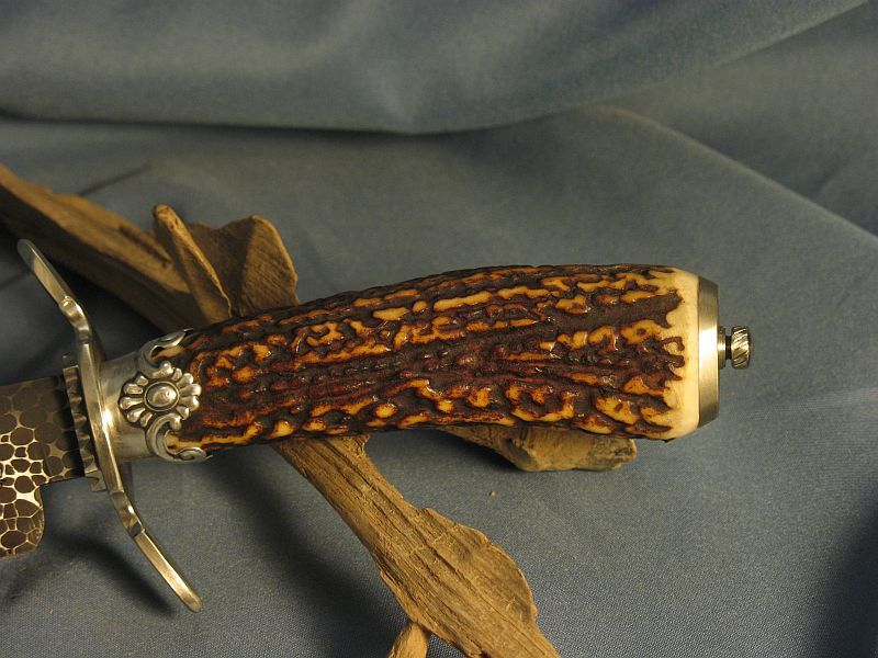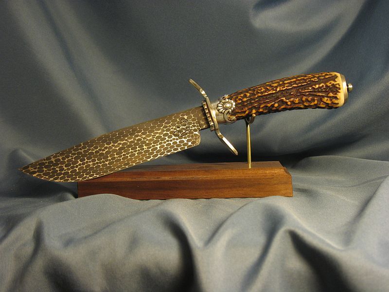 Here is a neat one that I just completed. Guard and buttcap are nickel silver and ferrule is sterling silver with a fine cut of stag that is good for right or left hand. Well balanced. I made the snakeskin damascus out of 52100 and 4800KC steel. Hell of an edge holder. Blade length is 6 3/8 inches and overall length is 11 1/8 inches. Comes with stand of black walnut. Knife and stand are "SOLD" and 8.00 for mail in USA address. My paypal is dangraves4923@earthlink.net