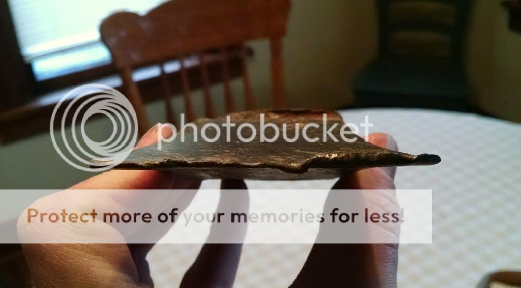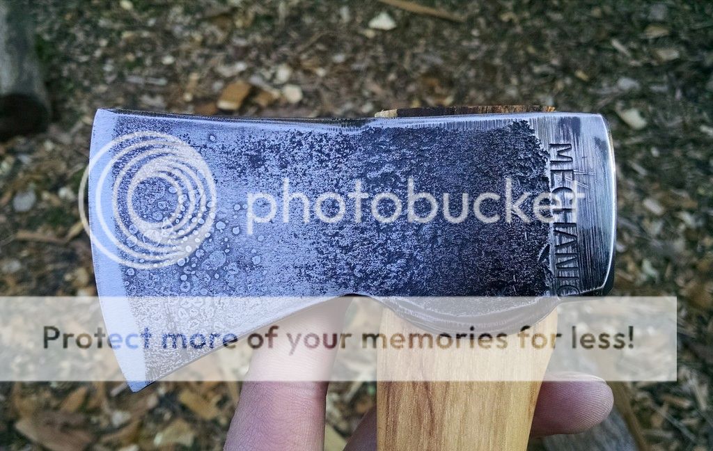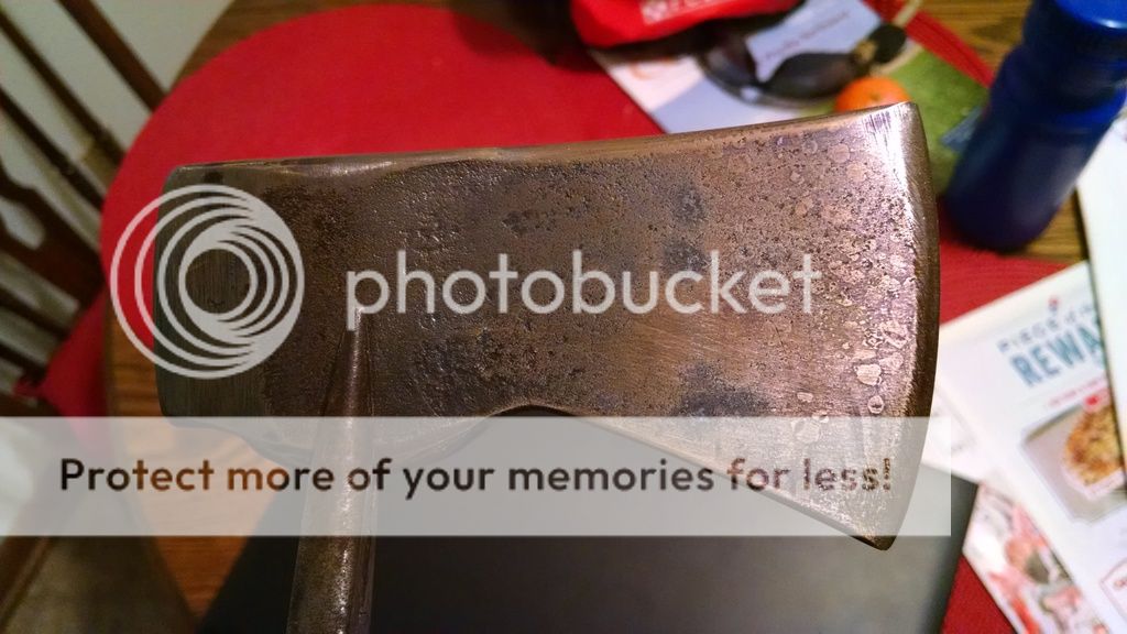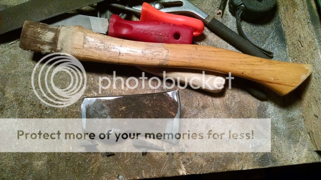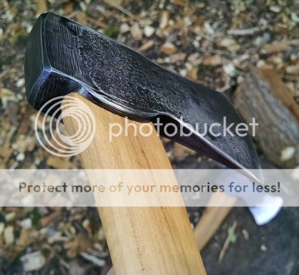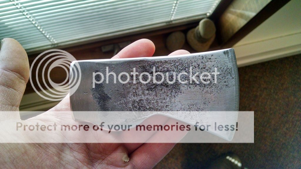 That would make a good band name. I bought this little 1.5# hatchet head when I was 12ish while at a garage sale with my Grandma, and hung it (beat it with a metal hammer till it was mostly on and wedged it with 3 nails) on a hardware store handle. I was not nice to this little guy. I must have stuck it in a campfire at some point, as there was no hardness left in the bit, which was very beat up. I also remember using it as a wedge to help split a few hedge logs for bowstaves, which accounts for the severe mushrooming.