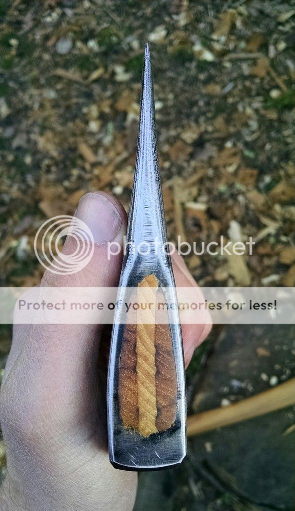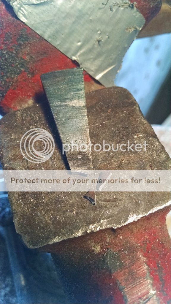 I was short of hands during the heat treat process, so no pics. Treated it the same way I do my 1084 knives, normalize a few times, take it to non-magnetic (~1500 F) and quench in 120F canola oil. Success! My file was skating like Michelle Kwan. I then tempered in my little toaster oven at 450-480F twice for 90 minutes, which left me with a dark straw/brown color. The final weight was 1# on the nose.