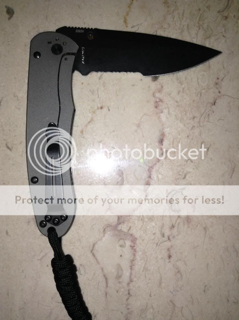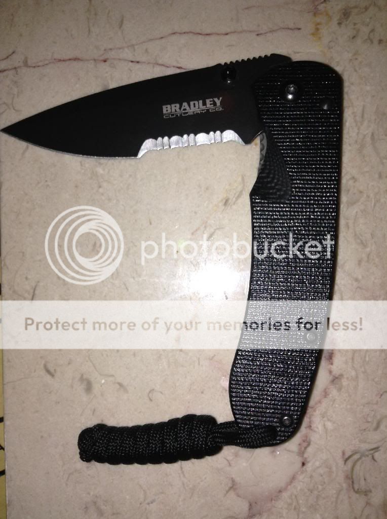 Bradley Alias I ltd edition, Ti and G10, part serrated Black DLC, carried around the house, cut some paper.