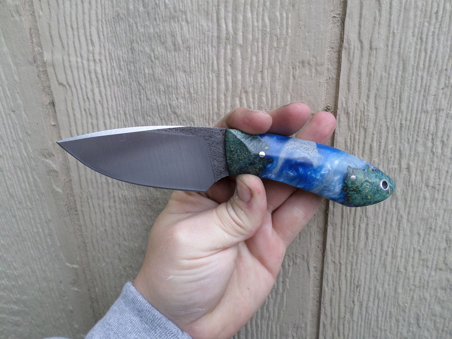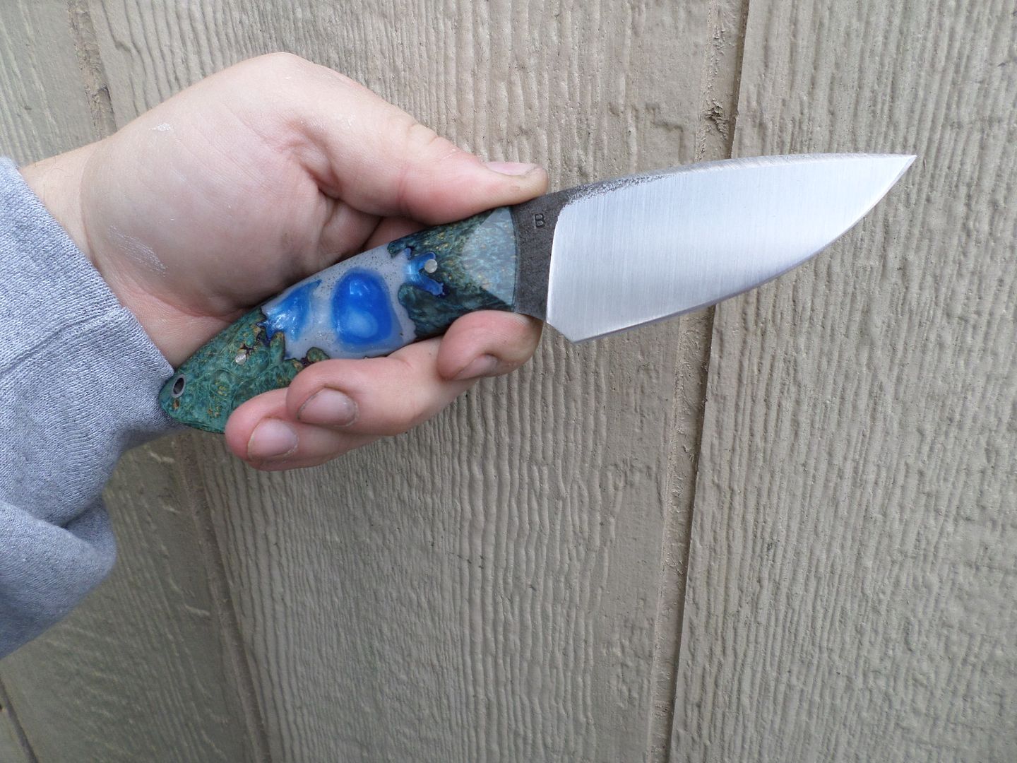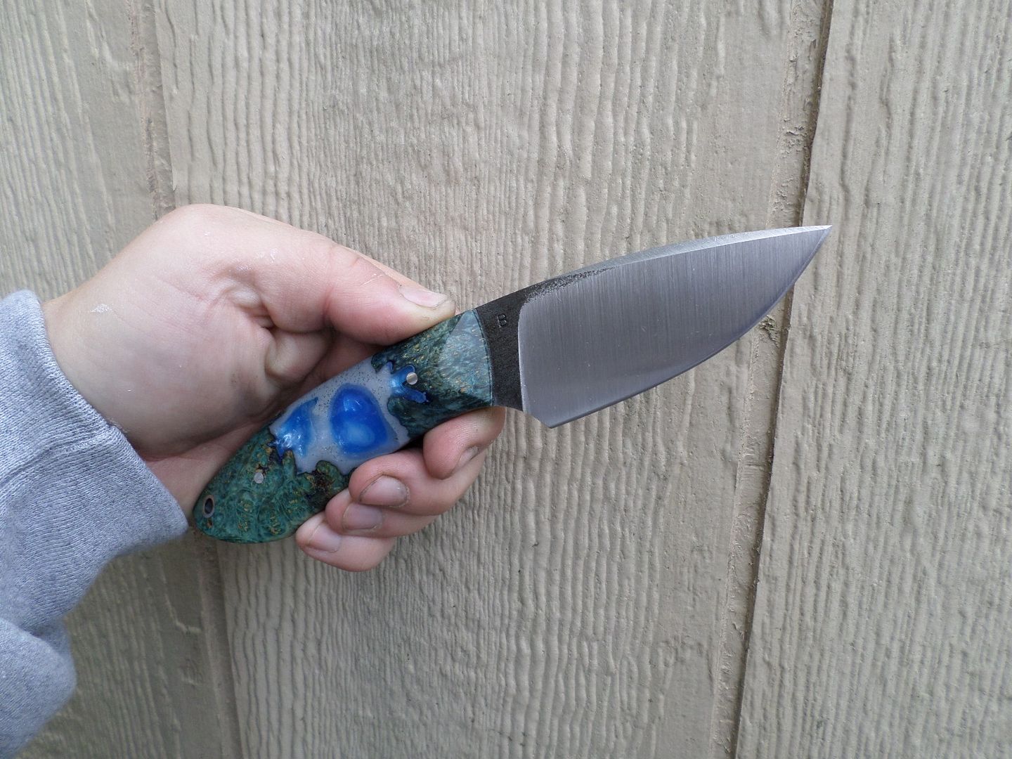WHATS UP GUYS??!! THIS ONE IS PROBABLY ONE OF MY FAVORITE HUNTERS IVE DONE! SUPER COMFORTABLE IN HAND AND HAS KIND OF A HUMPBACK SHAPE WHICH IS CONDUSIVE FOR A FATIGUE FREE CUTTING ANGLE! I CANT REMEMBER FOR THE LIFE OF ME WHAT THE WOOD IS ON THIS ONE BUT ILL TRY TO FIND OUT IF ITS ALL THAT NECESSARY! THE RESIN CAST BLUE IS JUST FLAT OUT BAD ASS ON THIS! HOPE YALL LIKE IT AS MUCH AS I DO!