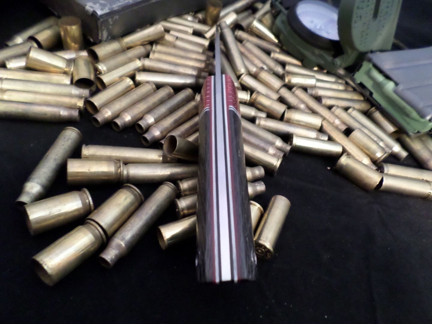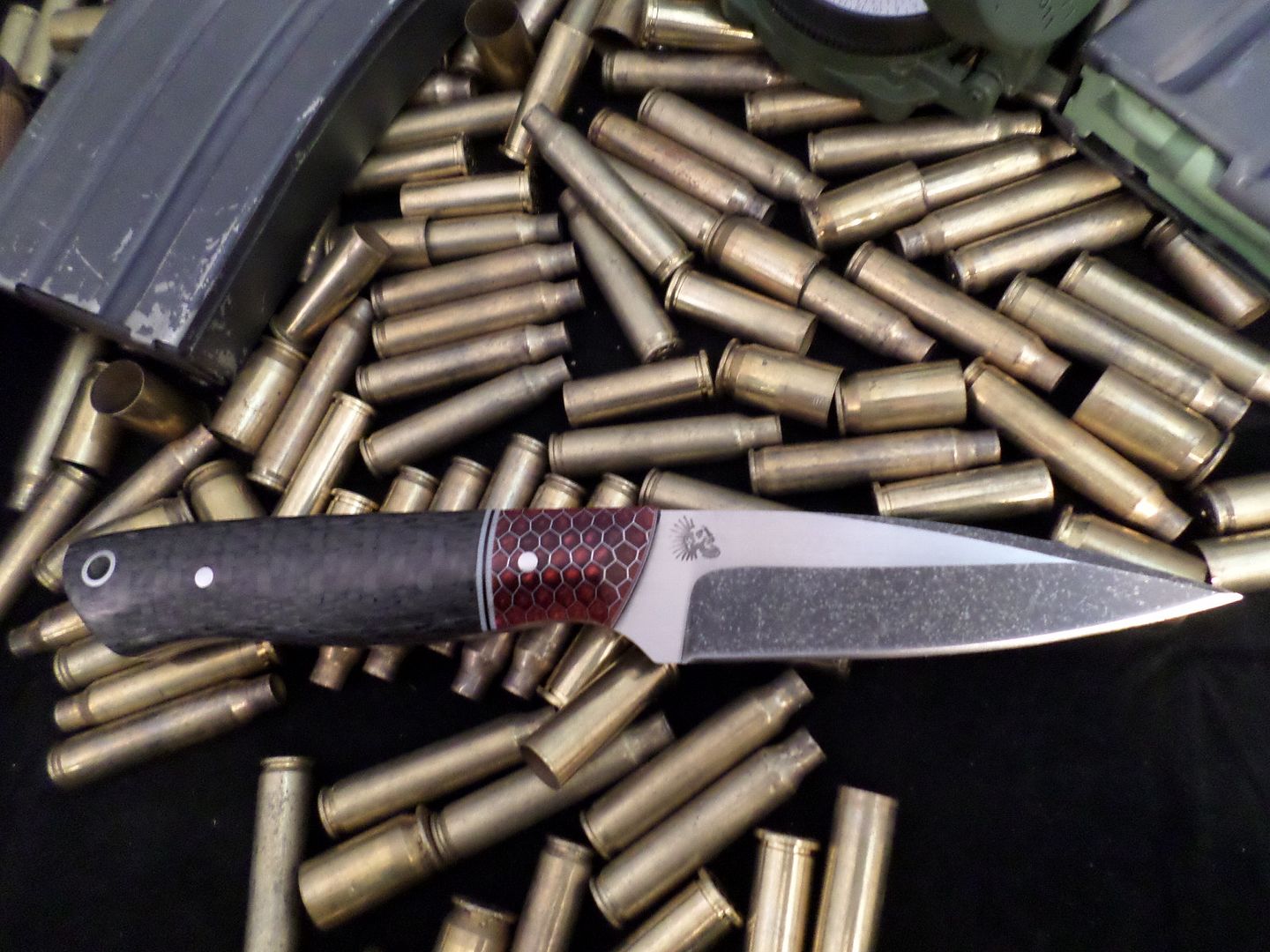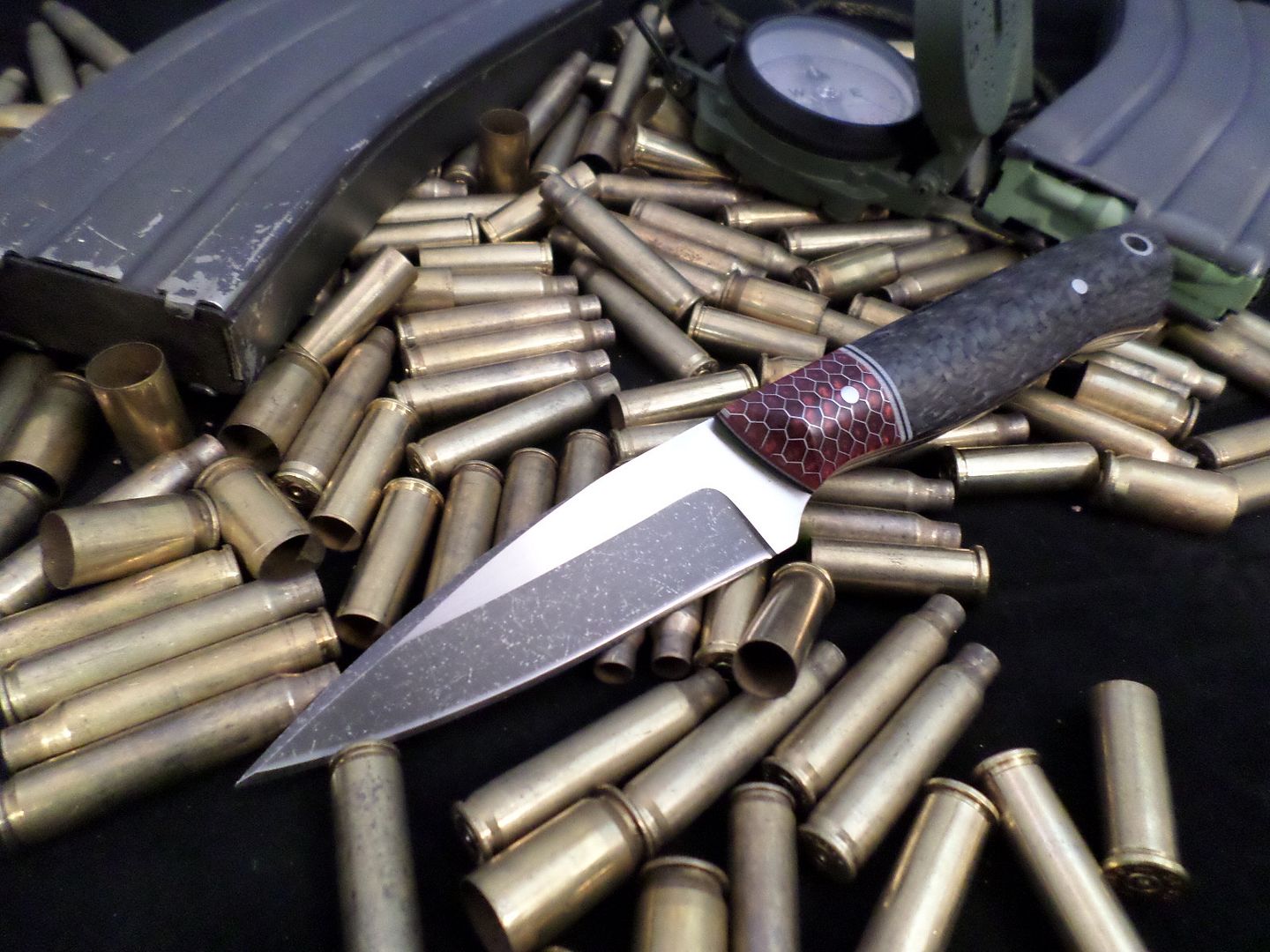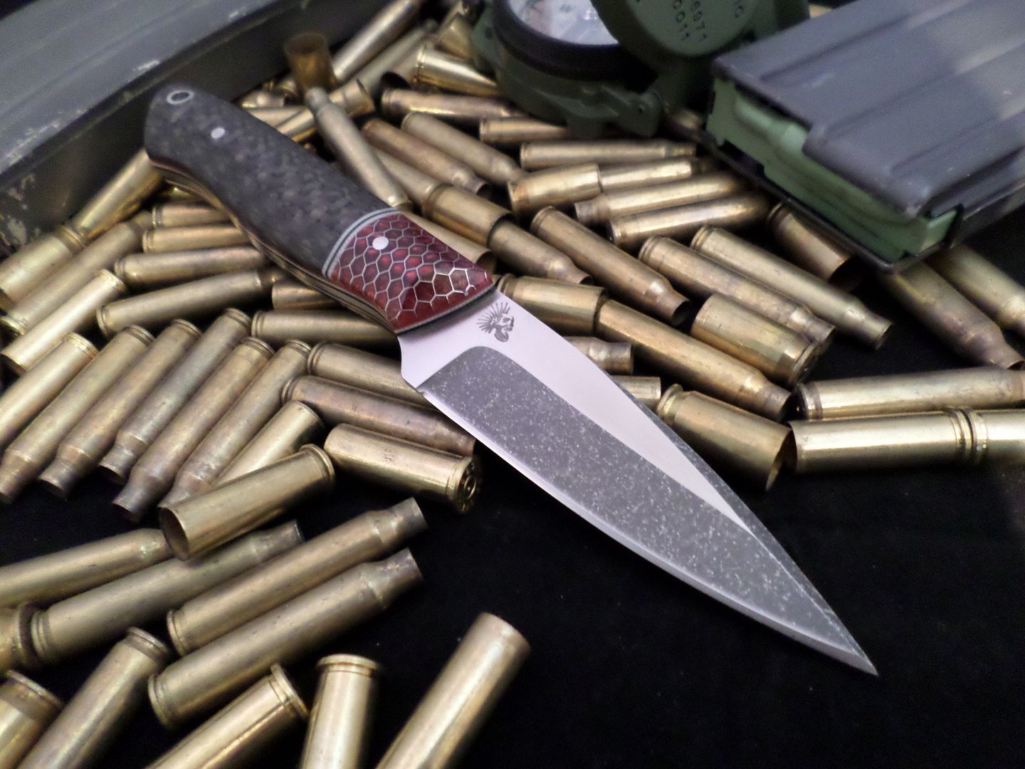 HANDLE SCALES- RED,WHITE AND BLACK LINERS WITH BLACK AND WHITE SPACERS SEPARATING RED CTEK BOLSTERS AND CARBON FIBER ON THE ASS!!!