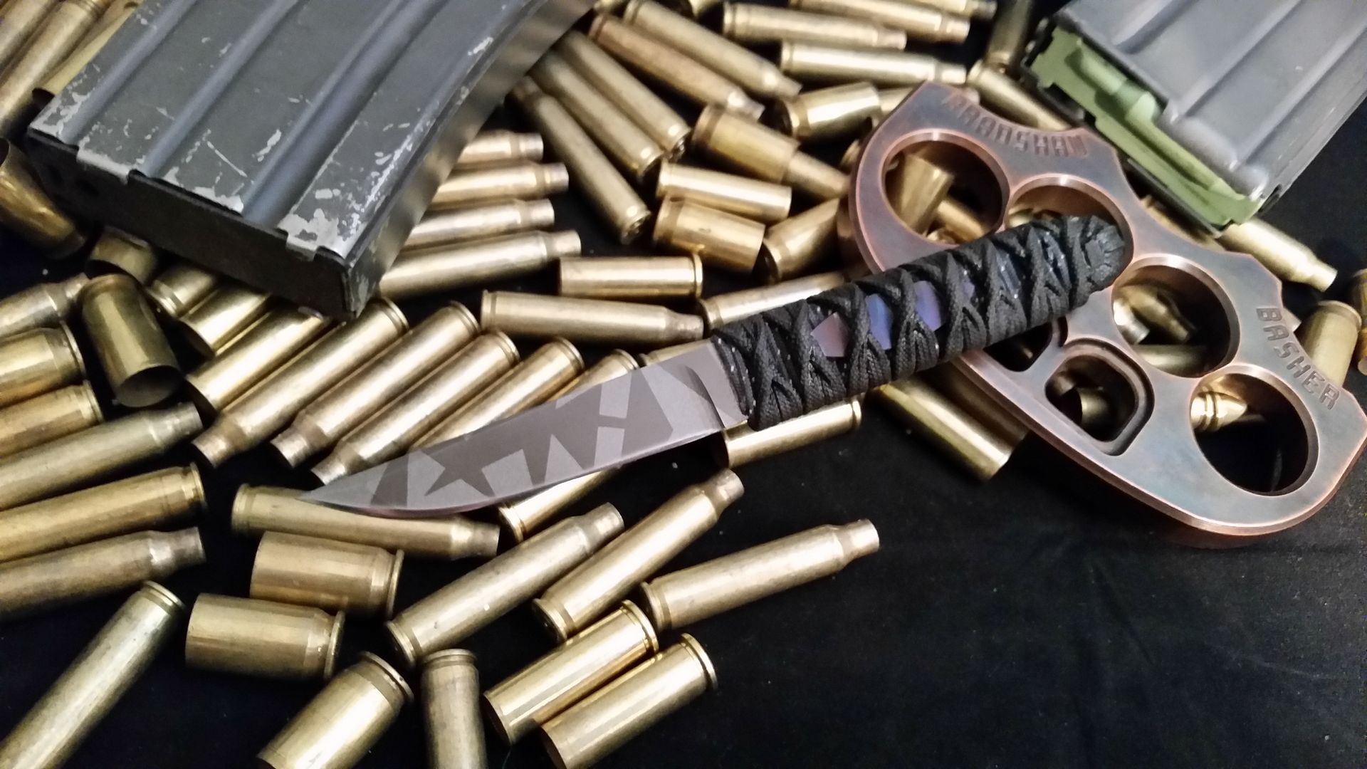 WELL HERES A NICE KWAIKEN FOR YA! NICE HAND MADE MENUKI FLAMED BLUE AND PURPLE ALSO IT IS COMPOUND GROUND WITH A PENETRATOR TIP! NEW FINISH AS WELL THAT IM CALLING URBAN CAMO! DIG IT!!