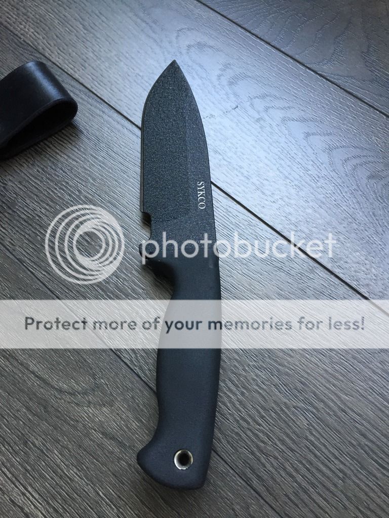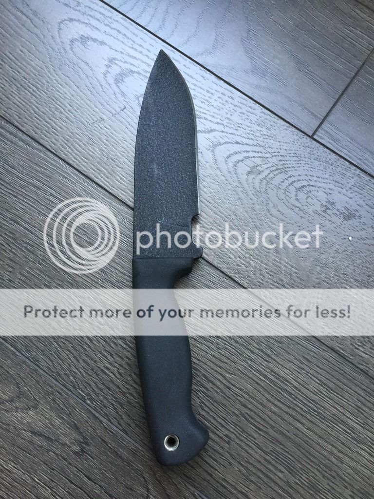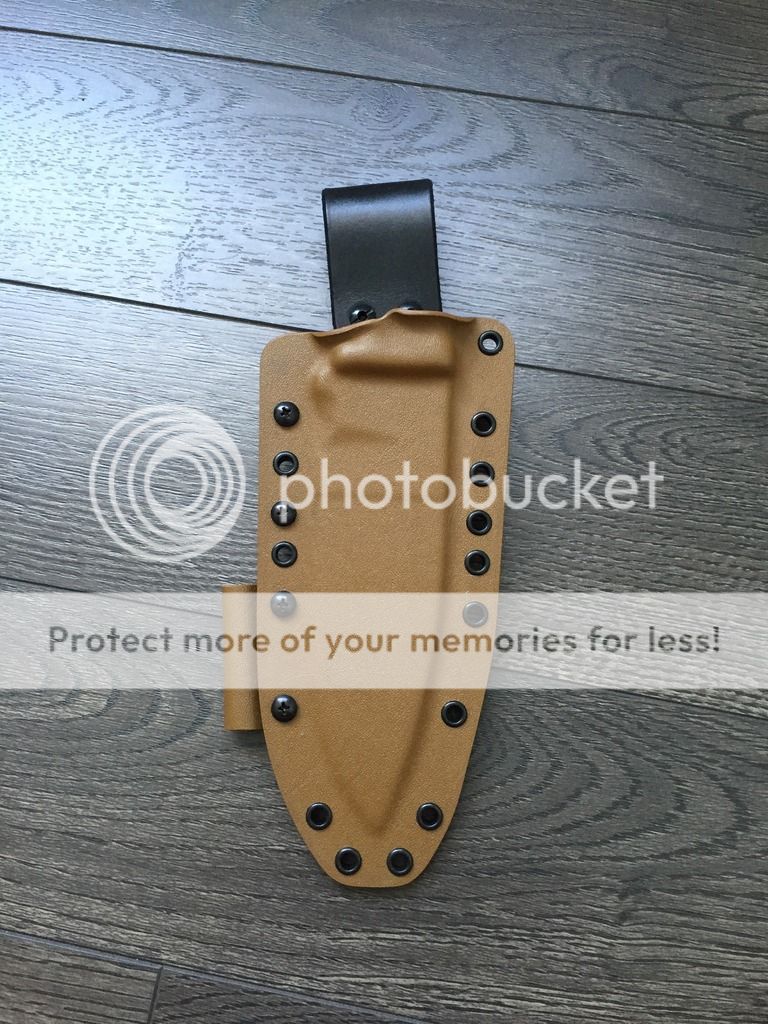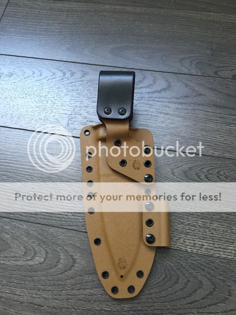 It's a brand new TRASH 1, never used it, comes with tactical card board and a tan Azwelke pancake sheath in tan with a black leather drop loop. Sheath also has firesteel loop built in.
