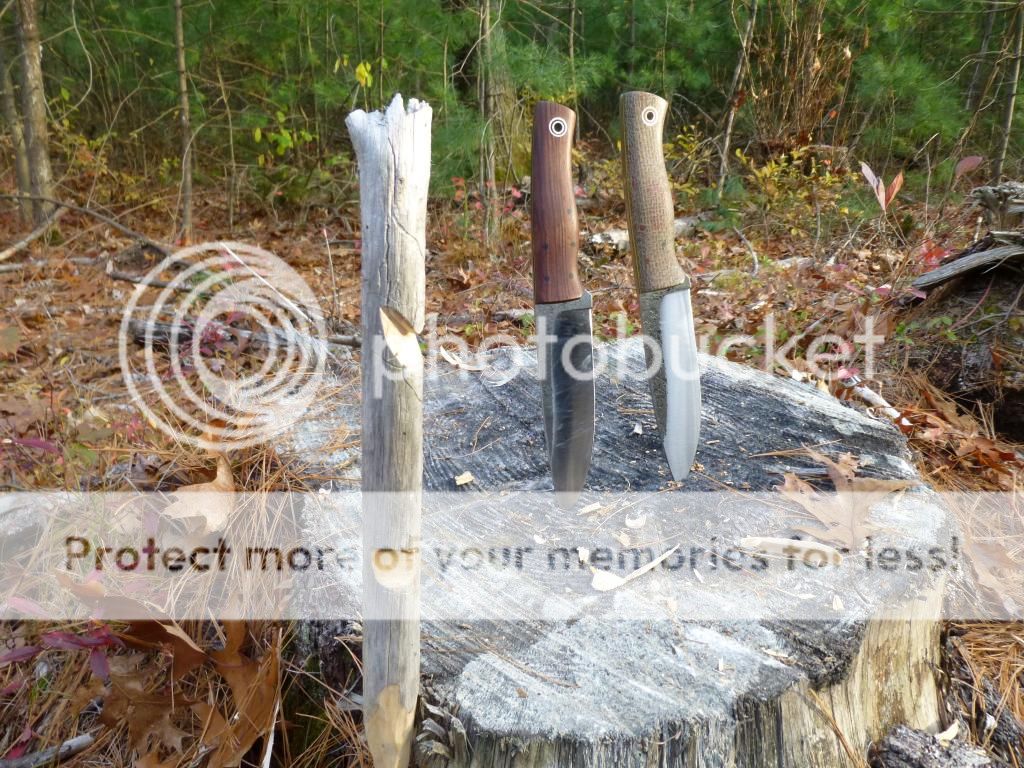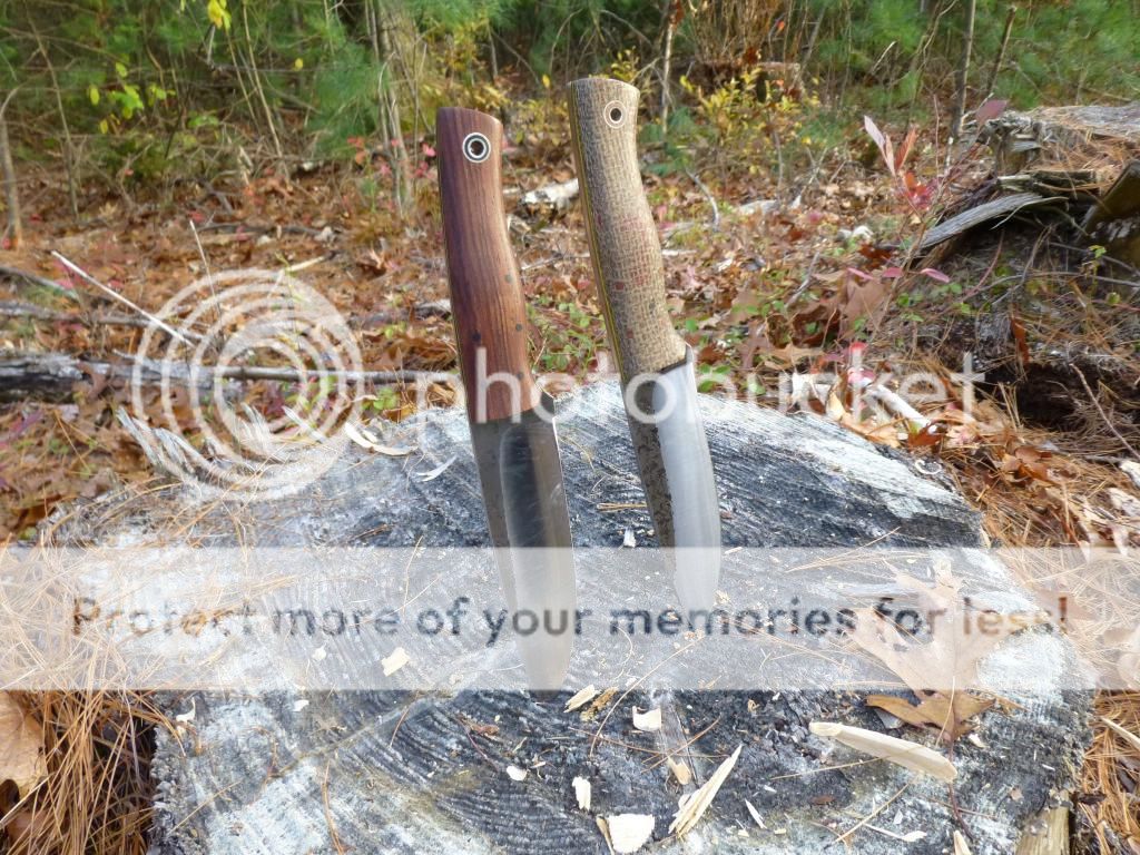 My son and I finally got a little time to get in a walk in the woods today, and we thought we'd get out and enjoy our Fiddleback Forge Dukes. My Duke has a rosewood handle and my son's has a beautiful coffee bag burlap micarta handle. Guess I'm old school as I prefer the wooden handles on my knives.