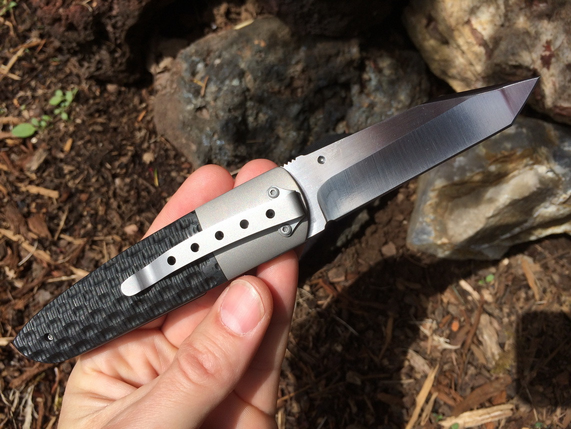 For sale is this Tim Britton recondo tanto liner lock. Steel is s35vn, blade length of 3.25in, oal is 7.75in. Scales are jigged micarta and Ti bolsters. Grinds are very clean on this, hollow ground with swedge and flat ground tip.