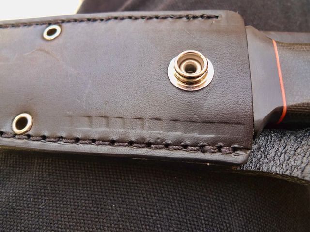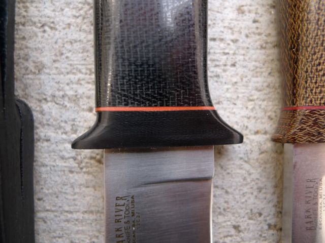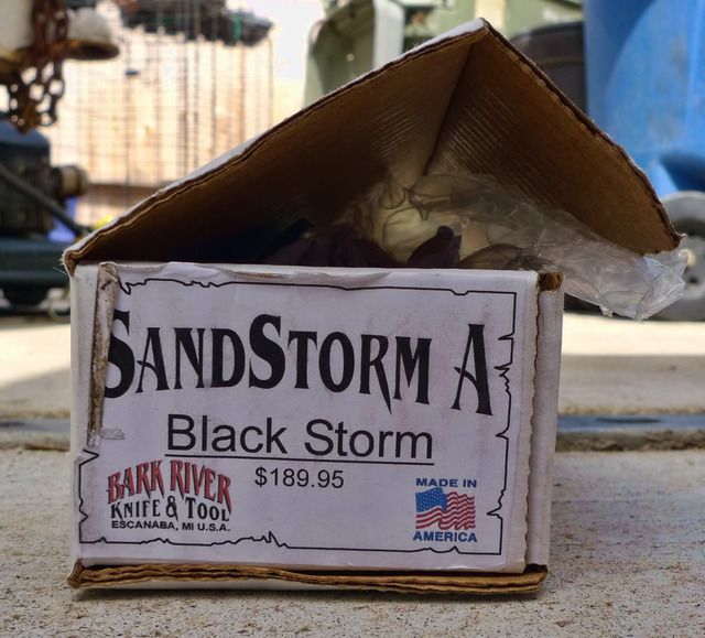 The sandstorm A appears to be unused. It comes with what appears to be black canvas micarta. The gaurd is shifted slightly away from the handle. I don't know if it came from the factory like that, but since it appears to be unused I'm assuming it did. The leather sheath's retention strap is still tight from having not been used, but the leather face of the sheath does show some light shelf wear. This comes with it's original box, but no paperwork.
