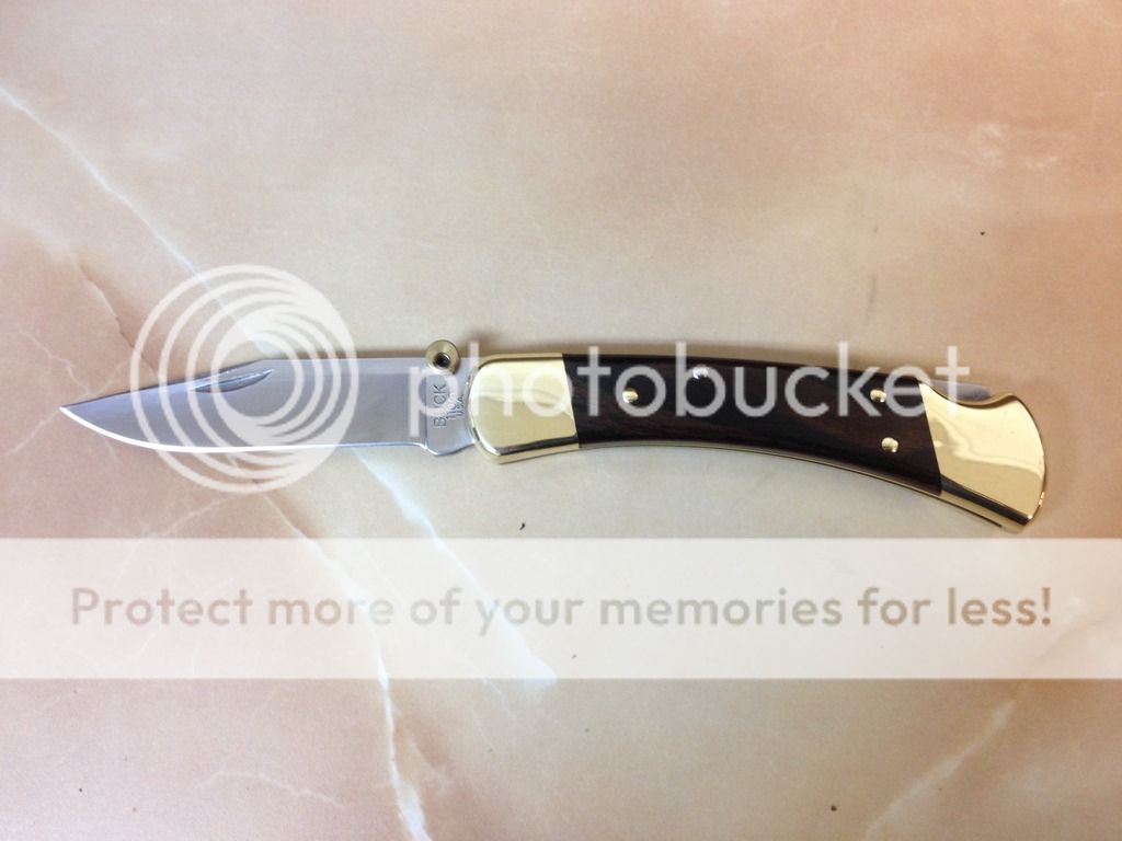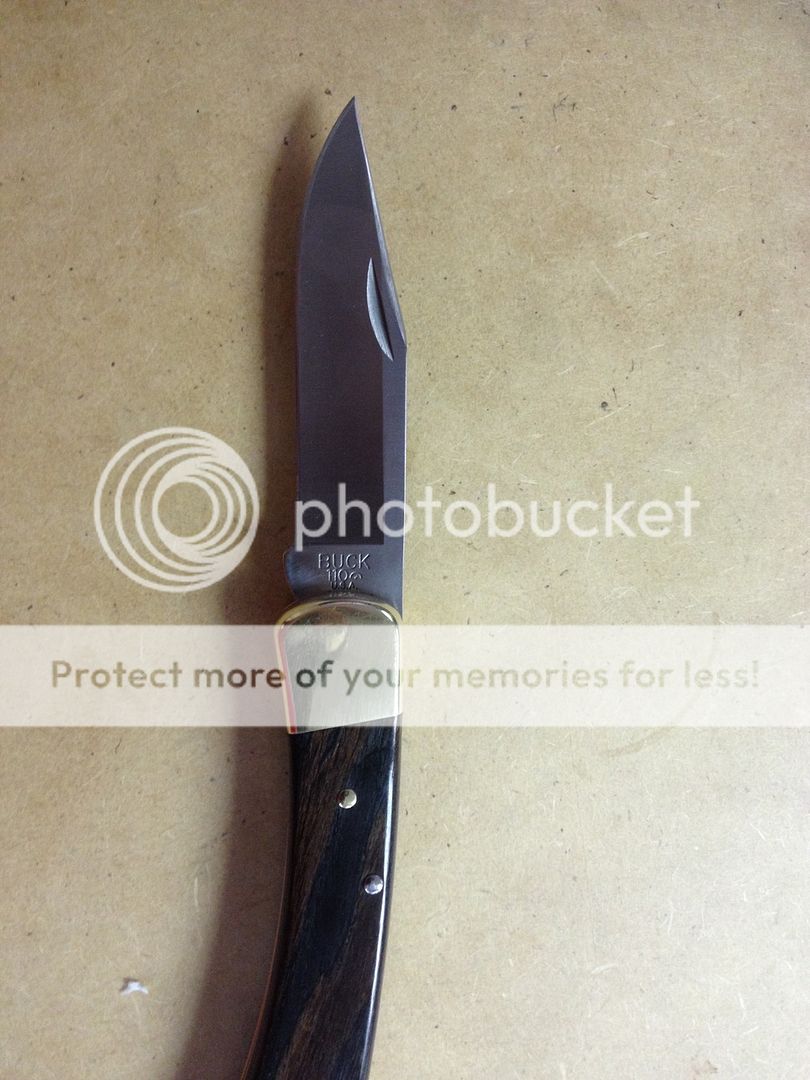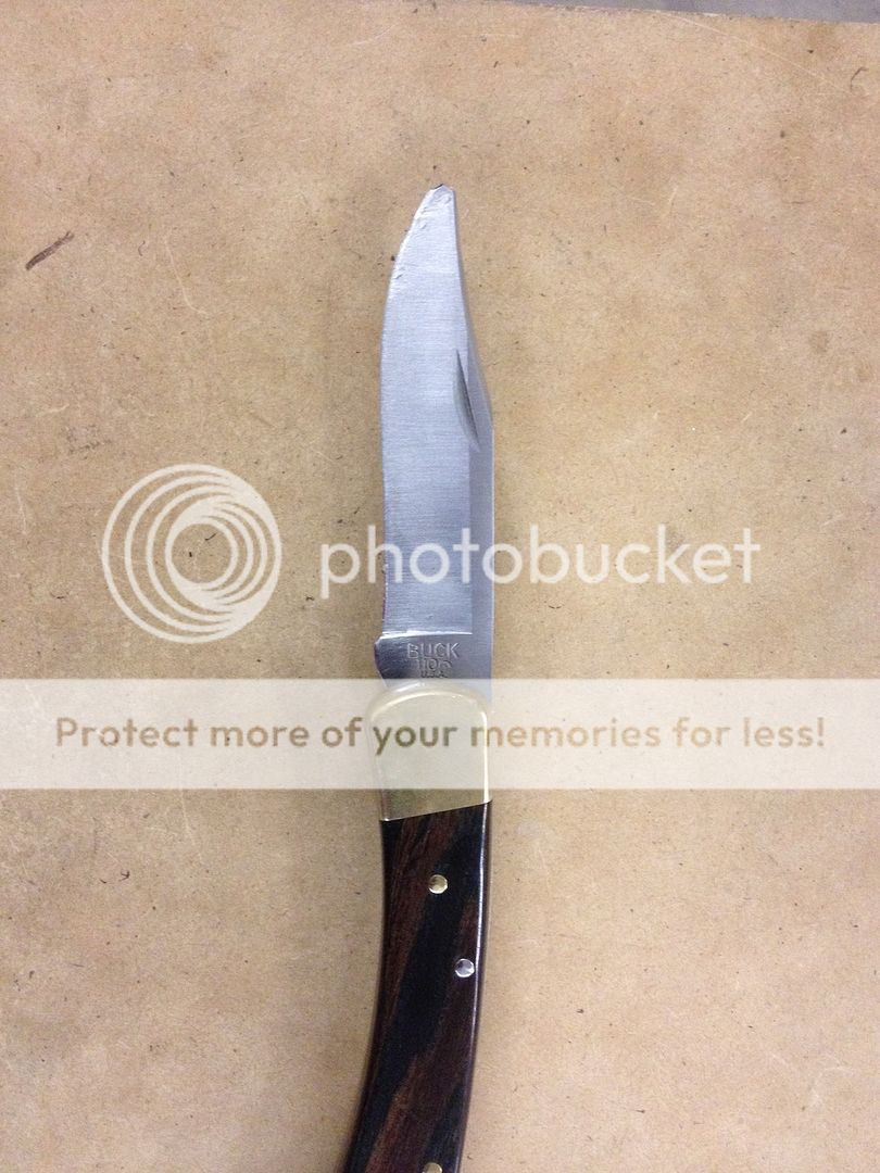 At lunch time, I made my sandwich and got my little Harbor Frieght belt sander out of the car and went to work. I ground down the blade from the spine end until I got the tip almost where I wanted. Then I did a tiny bit of grinding on the edge side. I'm not completely happy with my swedge grinding abilities but this 110 has a wicked point once again. And while I had the sander out I restored the edge to its former glory. Polished up a little bit and back into my pocket. I cut open boxes with it for the rest of the day. I believe this one is going in a backup sheath on my belt for tomorrow.