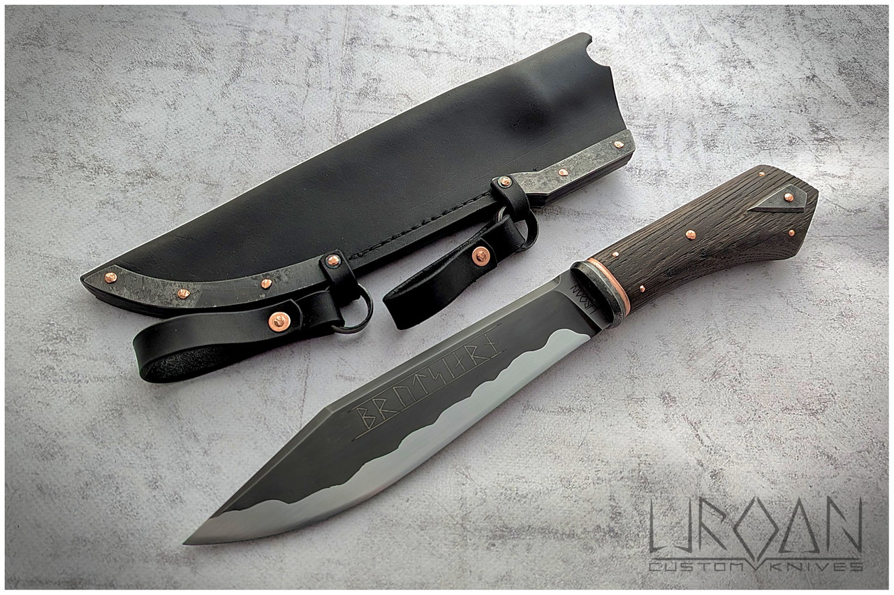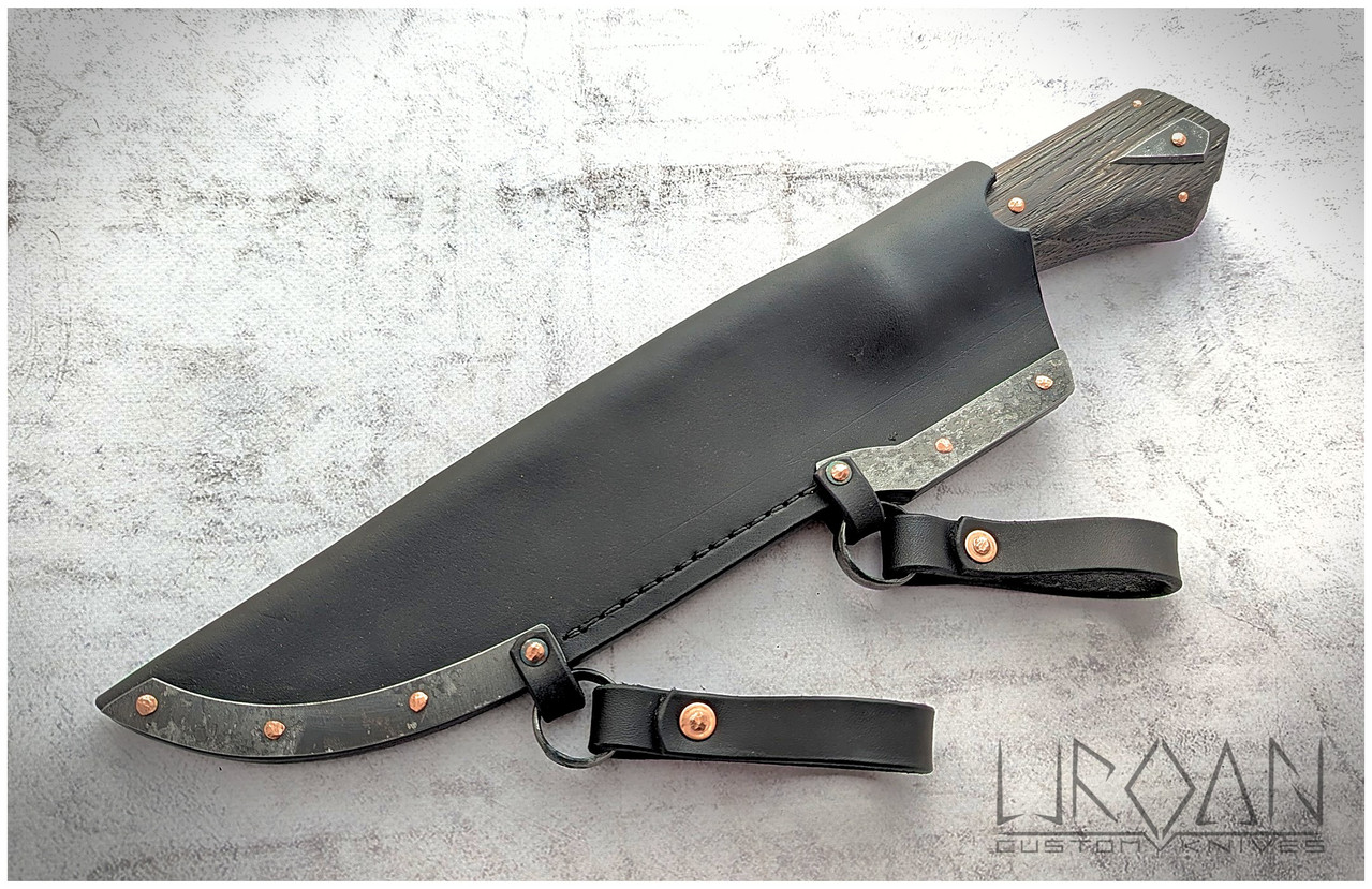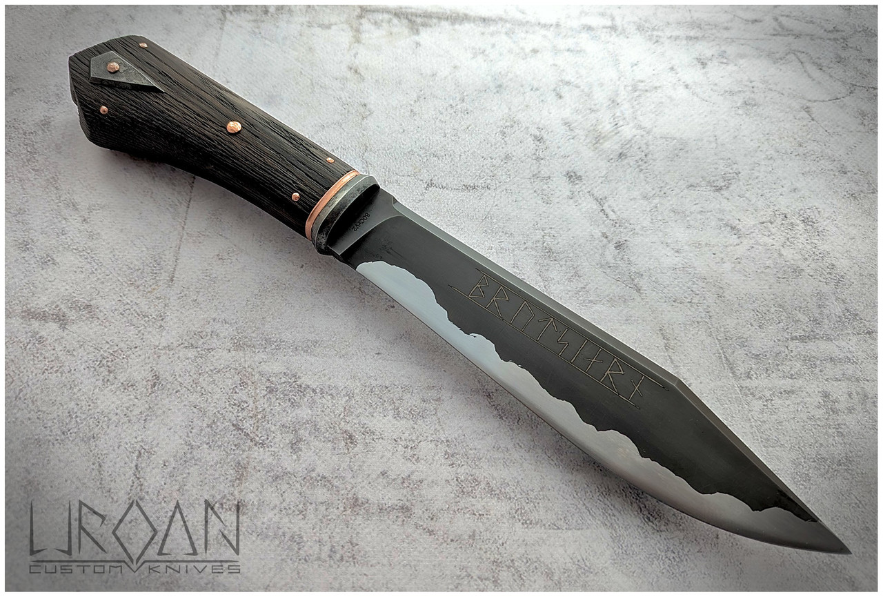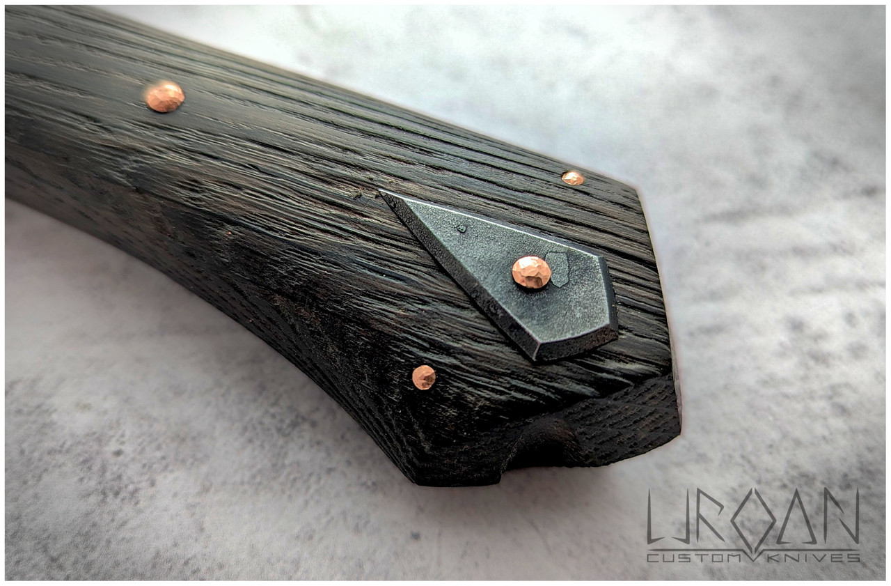 The hidden-tang handle is made from brushed black oak, secured with copper pins. The guard and decorative emblem are made from fire-aged steel.