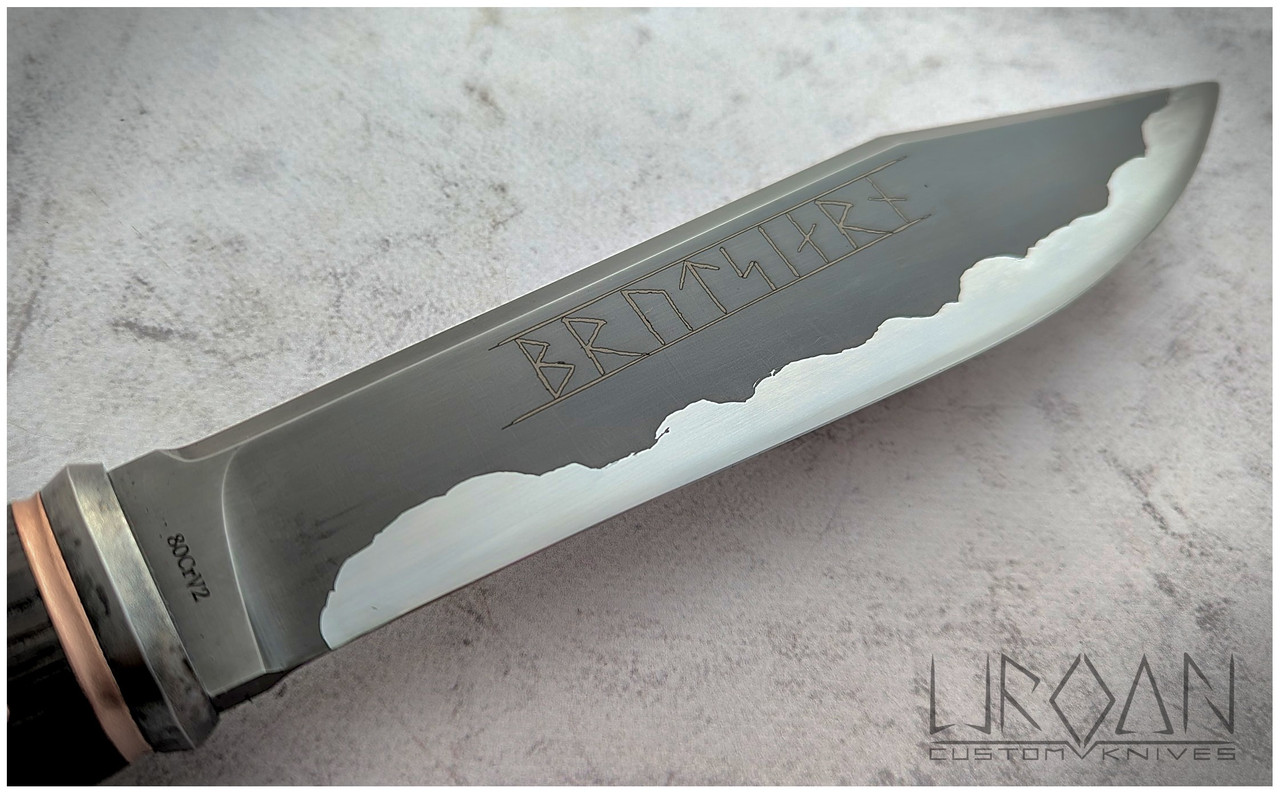 The name of this knife is tied to a bit of a story. After 14 years of making knives, I finally broke my first blade. The knife was originally meant to be another seax — much larger than this one. However, the remaining piece of steel was still big enough that I decided to give it a second chance. That’s how Brotsjárn came to life. Its name is engraved on the blade in runes of the Younger Futhark.