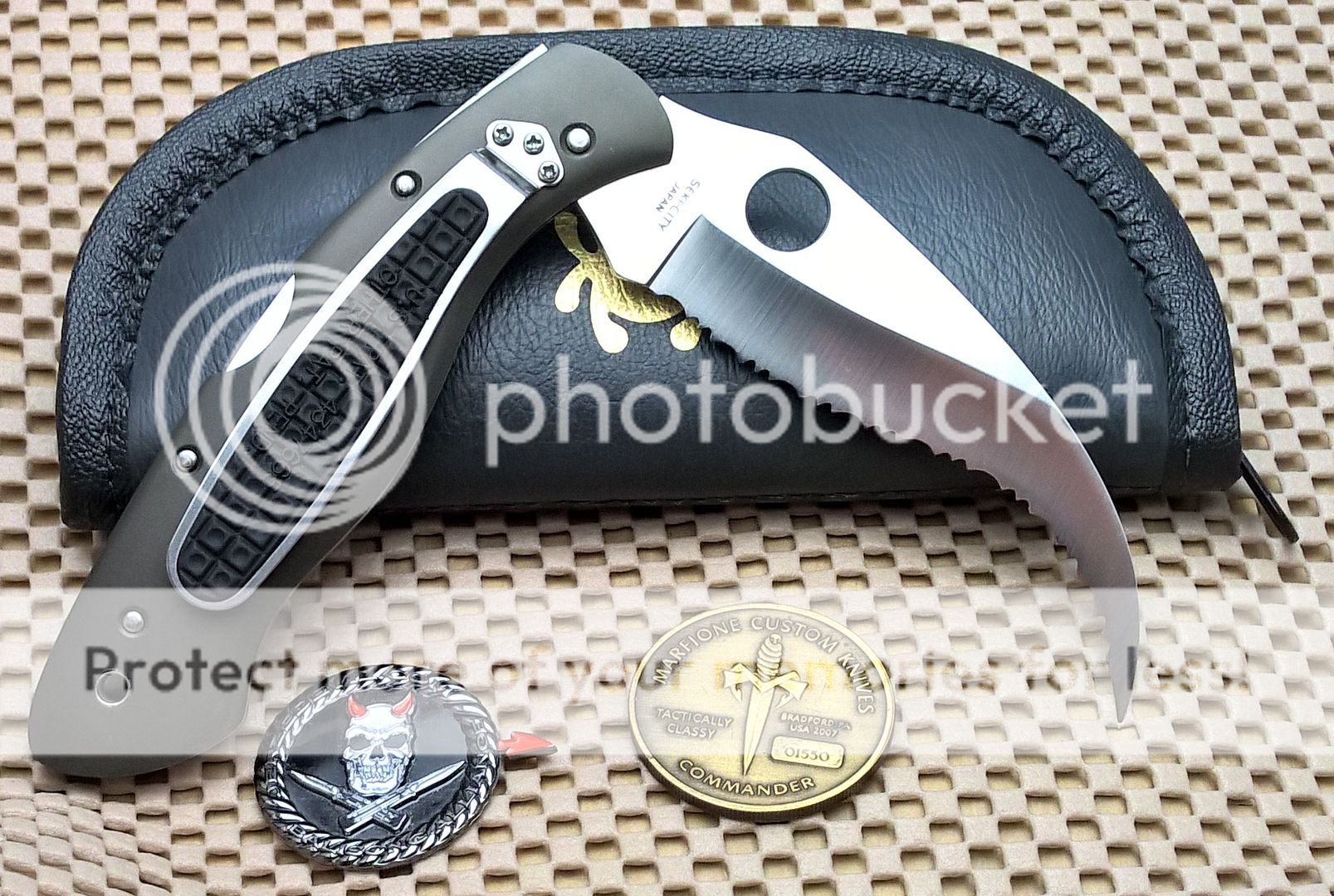 This is a staple of the Spyderco Family , the Civilian in Tuffram Configuration. This knife was made in the early to mid 1990's and features a relatively rare steel, GIN-1 Stainless. These knives were made with a variety of different steels. This knife features a 6061-T6 Aircraft Grade Aluminum Handle with a Rubberized insert. This knife comes with the original padded soft case that it came with new from the factory.