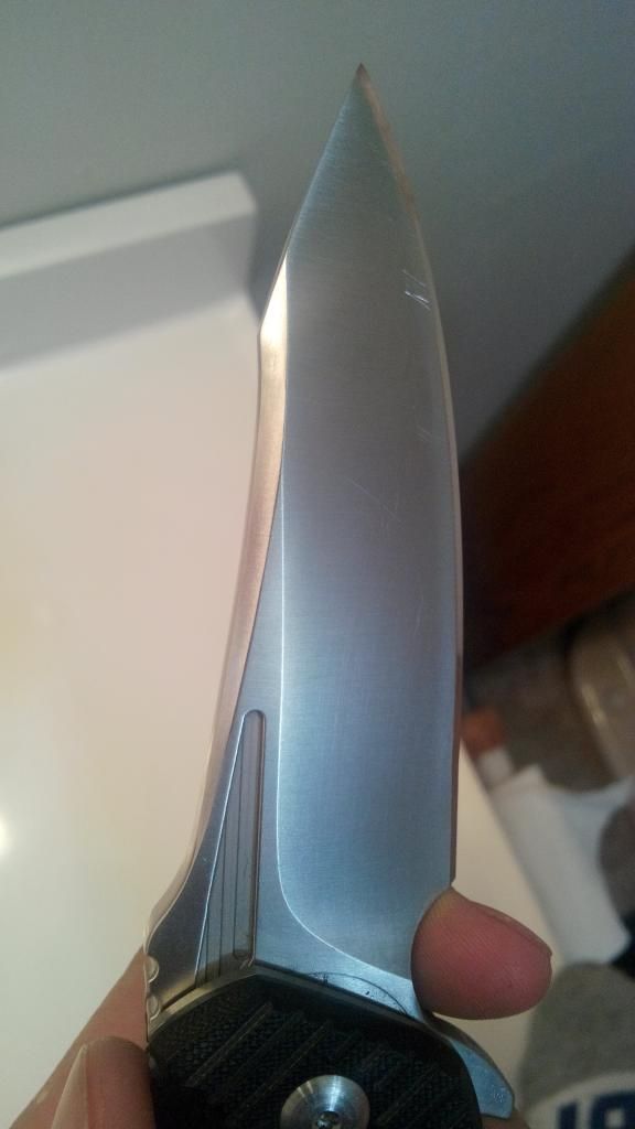 I had Jason put a finger choil in the blade to aid in sharpening as well as practical purposes. Knife has been carried and used. The satin blade shows scratches which are from sharpening. Knife is a user and definitely not like new. Although it has been carried and used it still functions flawlessly and is absolutely the SMOOTHEST FLIPPER I've ever held... smoother than my XM 18. The detent is perfect, its stout but not overly tight like a lot of knives now made. IF YOU HAVE WANTED TO CARRY A BROUS KNIFE DO NOT MISS OUT ON THIS ONE. You will not be disappointed.