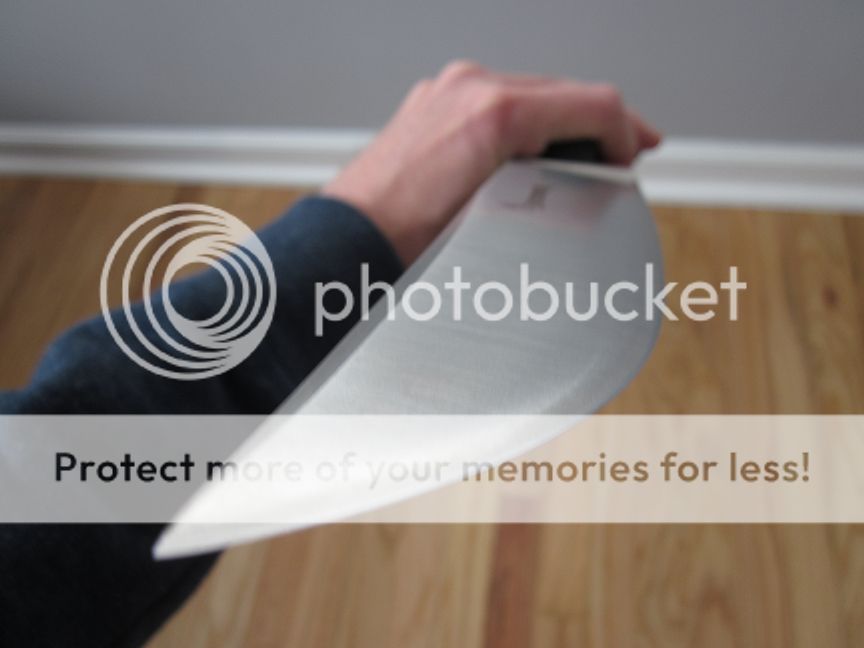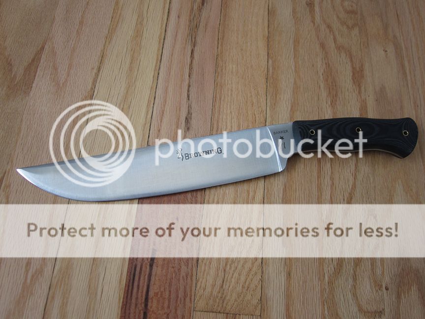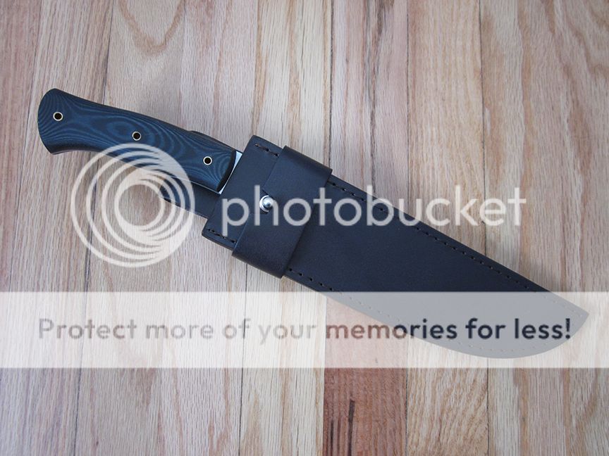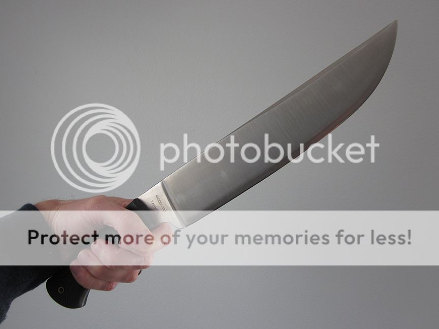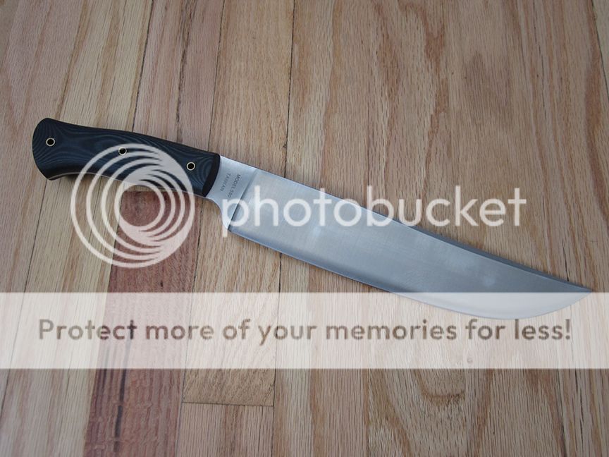 This model has been discontinued and is increasingly difficult to find. 9 inch cutting edge, 15" OAL. 3/16" thick high carbon steel (1084 I believe) with full height flat ground blade and blended convex edge. Tapered tang, distal tapered blade, and swedge grinds. Black micarta scales, brass pins. Leather sheath and removable belt loop. Excellent balance, excellent edge retention. Razor sharp.