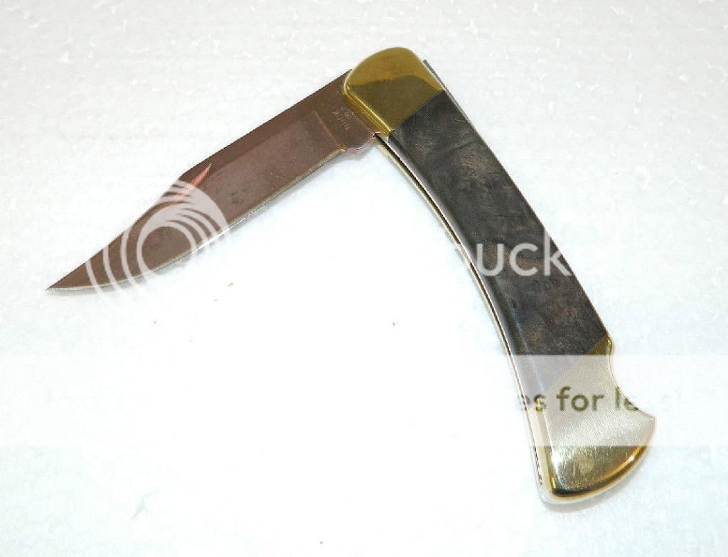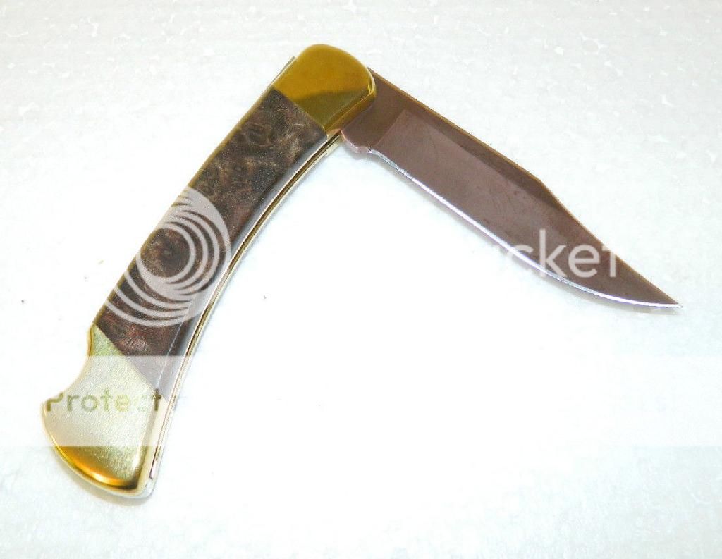 I'm unclear on this 110 I recently received. Date code is 2001. Tang stamped are BUCK; 110 (sq. bracket pointing down); U.S.A. Maple burl scales and red liners. Very nice looking knife, solid vertical lock with the slightest side play. The blade looks like Ion Fusion - it is a nice purple/champagne color, but it is sharpened on both sides. It appears to be a new factory edge. The blotchiness on the blade is just bad lighting, the color is very uniform. It appears to be factory mint. I thought the Ion Fusion was sharpened one side only for the performance of the coating material right on the edge. I've googled this in a number of ways, but I was hoping someone might shed some light on what is a mystery to me. Did Buck make a two-side sharpened purple coated blade? Is this a mint factory knife? Was it returned to Buck and re-sharpened? Or third party sharpened? Thanks.