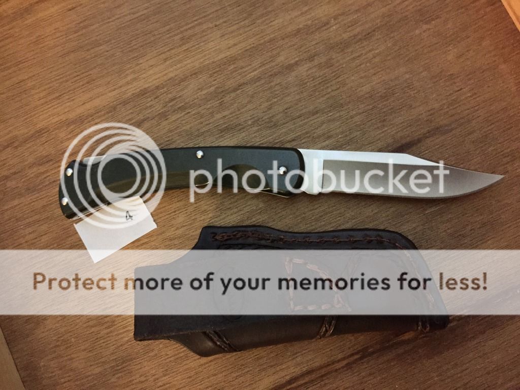 3. Buck 110 Anniversary With Rattle Snake Custom Belt Sheath: No boxI purchased this knife new and have used for minor tasks over the past year or so. Got this cool rattle snake skin belt sheath and thats how carried itpaid $40.00 for sheath. Some light usage marks on the bolsters. Centering is very sight center right. Easy 3-4 pull and solid lock up. Nice 4 on the LB release.