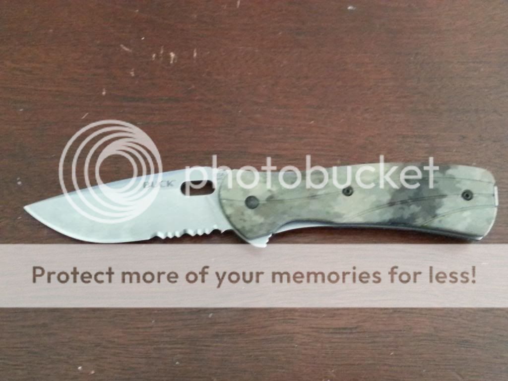 Buck Vantage Pro 845 for sale. Camo scales and stonewashed s30v blade. I've carried it a few times but not in the last year or two. Never sharepened. Solid lock up and nicely centered blade, no wobble when locked. I have the box and it will ship in a USPS small flat rate box insured. I cover all paypal fees. $60 shipped.