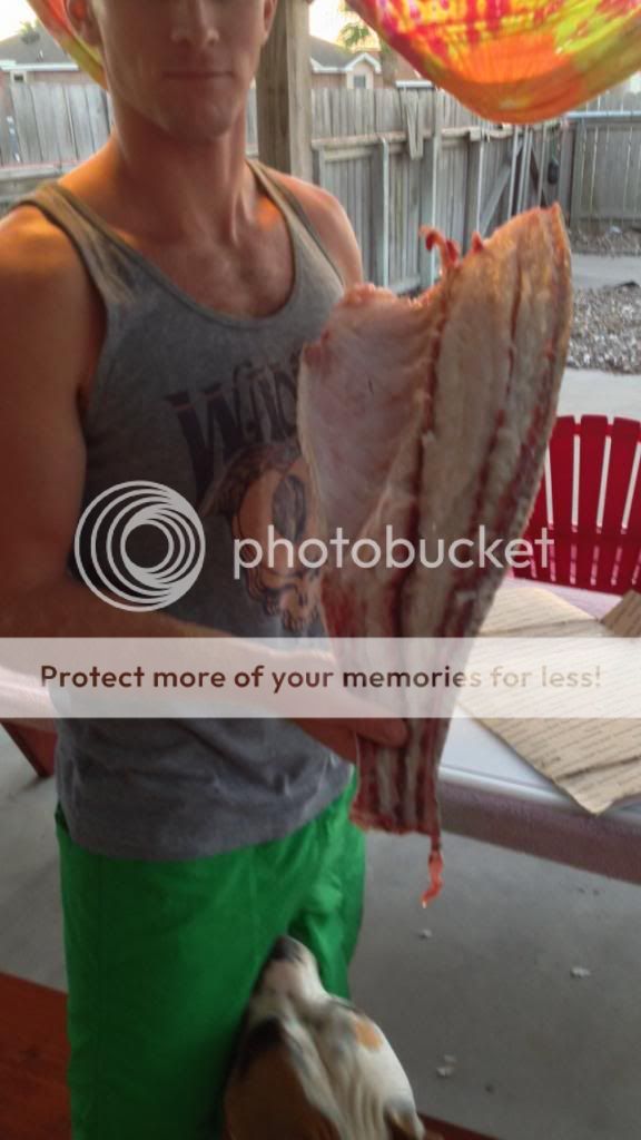 Thank you all! It is pretty funny how they make the BM look 'small'. 91wm6. I've read that before but everyone says that's just talk. I found them very tasty and so did everyone else. There are descent amount of veins that need to be cleaned out but as far as taste go's they were delicious. Not a flakey fish though. But very mild. Deadeye. I'm an Ensign down here for flight school. :thumbup: Here's what the fillet looked like before it was cleaned up.