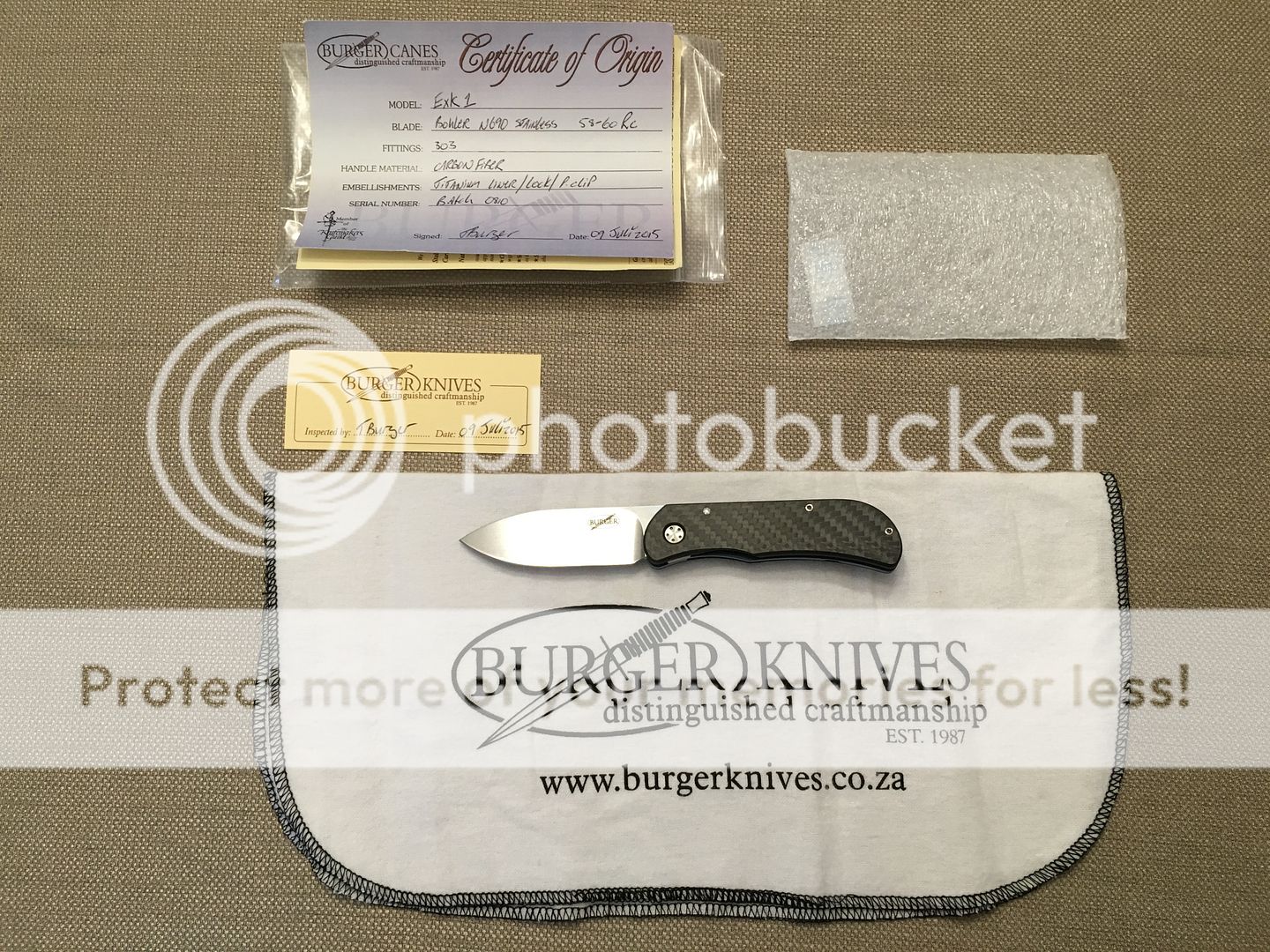 For sale is a Burger EXK 1 Carbon Fiber front flipper. This is an excellent knife produced by Burger Knives in South Africa. It has full carbon fiber scales, N690 steel, and blue anodized titanium liners and clip. The action is incredibly smooth and addictive. The lockup is solid and early as seen in the pictures and there is no blade play. The knife is LNIB except for a tiny scratch on the very edge of the pocket clip which can be seen in the pictures. Burger cloth, birth card, and paper work are included. Price is: $OLD NET via PayPal. Friends and Family and Goods and Services are accepted (add 4% for Goods and Services). Knife can be shipped tomorrow. First "I'll take it" followed by prompt PM and payment gets it.