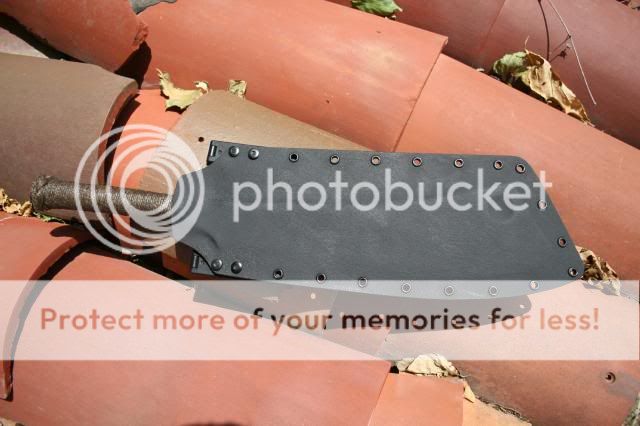 Kydex sheath with MOLLE locks. The blade is hair-shaving sharp, of course.