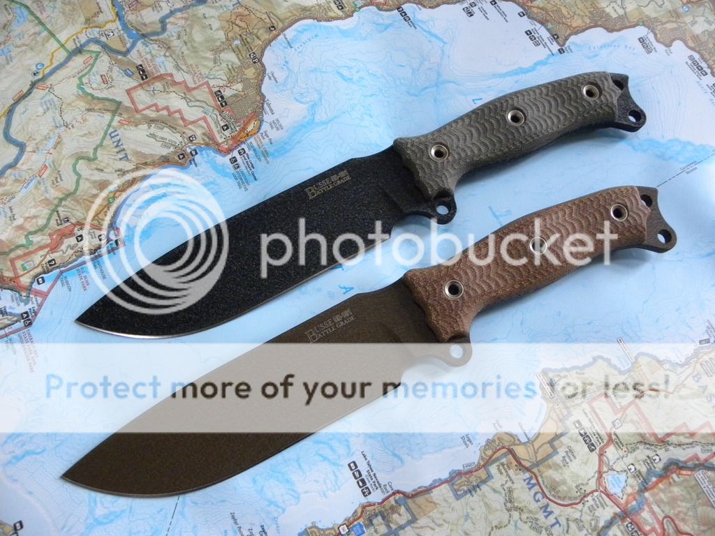 one gets it and the other will stay with me. These are both Battle Grade SR 101 steel and have never been used, sharpened or carried. They are as received from Busse in O2W. One is Black on Black Canvas and the other is Muddy Brown on Tan Canvas. Black one has a small gap in the handles that I have shown in the pics. Both come with their cardboard sheath and are sharpened by Beef.