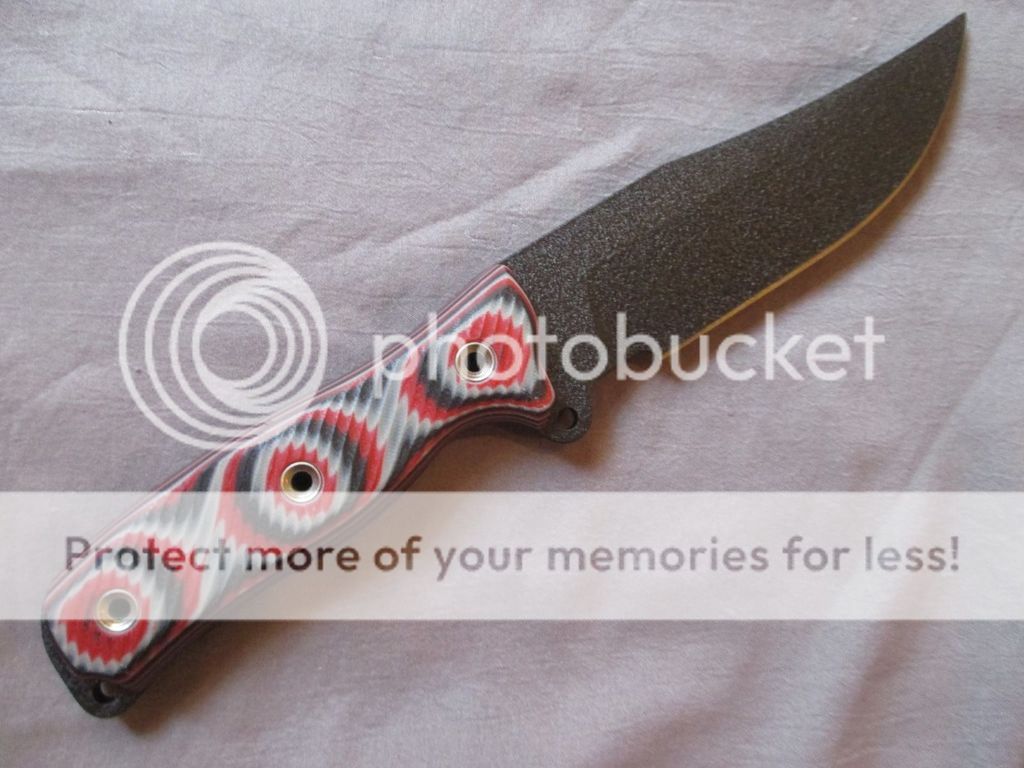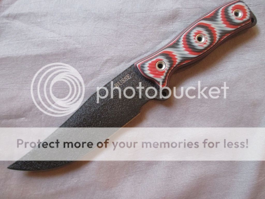 Busse BT6 (Bowie Team 6), new and unused. INFI steel, black coating. Handles are layered Red, Gray and Black (and maybe white?) G10.