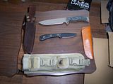 1. Combat Grade Boss Jack, Unused but has been stropped, Sage Blade, G10 handles appear to be Black/Tan. Includes pictured Leatherman sheath, $340.00. SOLD to raybo, Thanks!