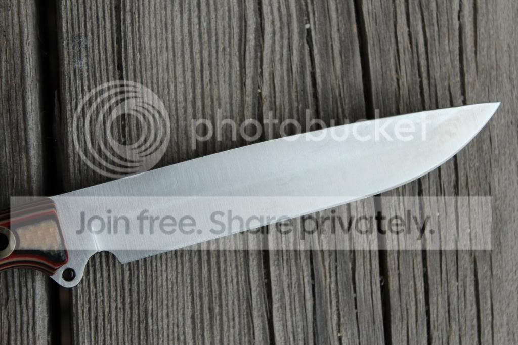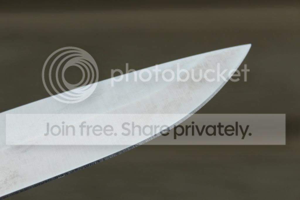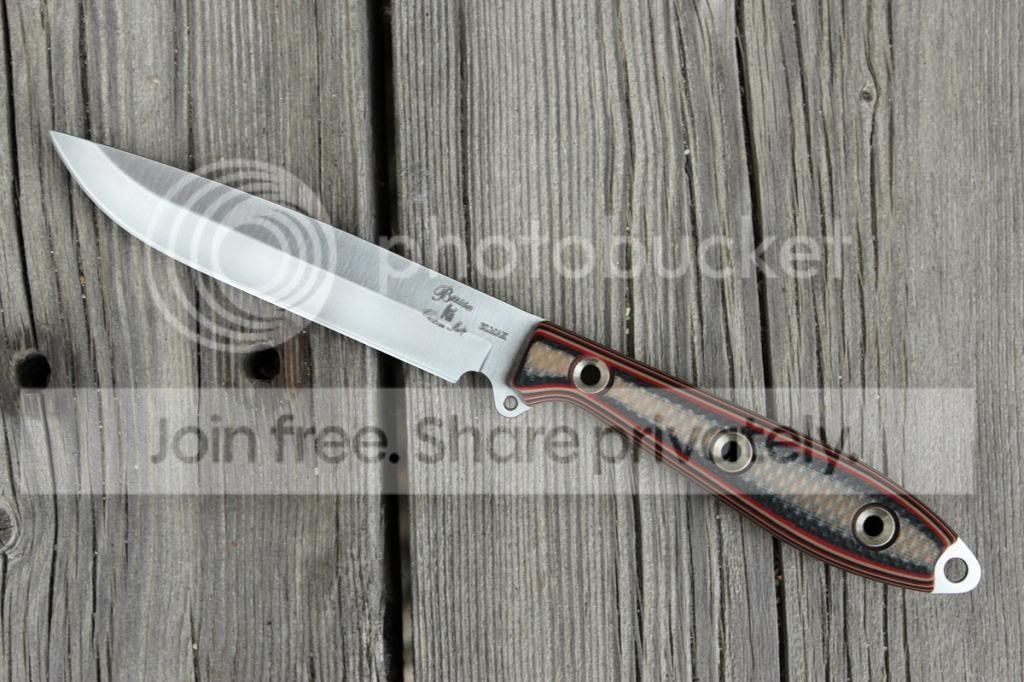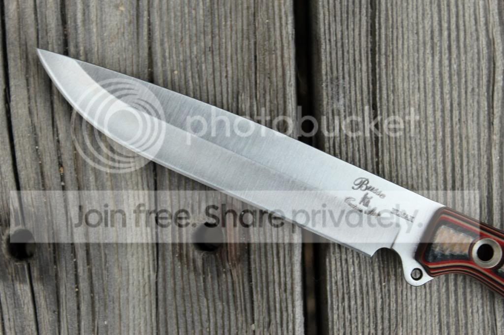 Selling this awesome steak knife from the last Ganza. It's in like new condition. I carved up a slow cooked smoked brisket with it, then thoroughly cleaned and coated in baby oil. Only flaws are some very light patina marks (I'm guessing), these came from the factory. (see pictures) Didn't bother me much, it was gonna be a kitchen knife for me, but I realized I could use money for an upcoming knife show now... same ol' story.