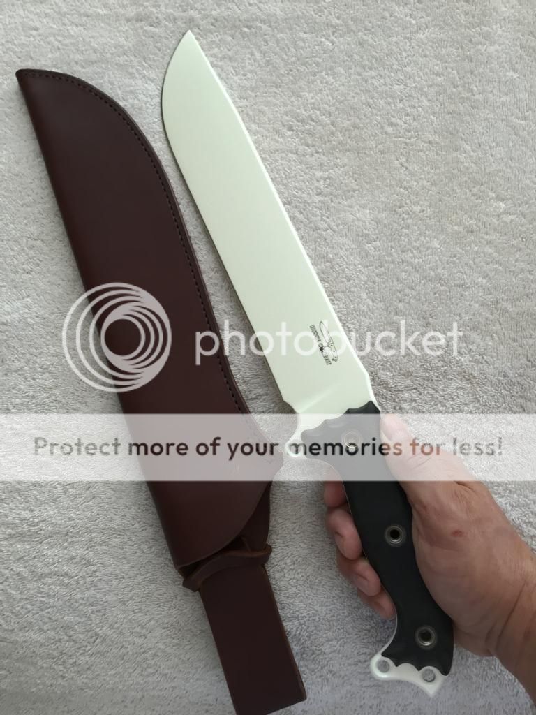 Sold - Busse Nuclear Meltdown Fusion Battle Mistress (NMFBM), White Coated INFI Blade, Black Hand Finished Micarta Handle, Leather Sheath by Stuart Branson - $800 - Sold